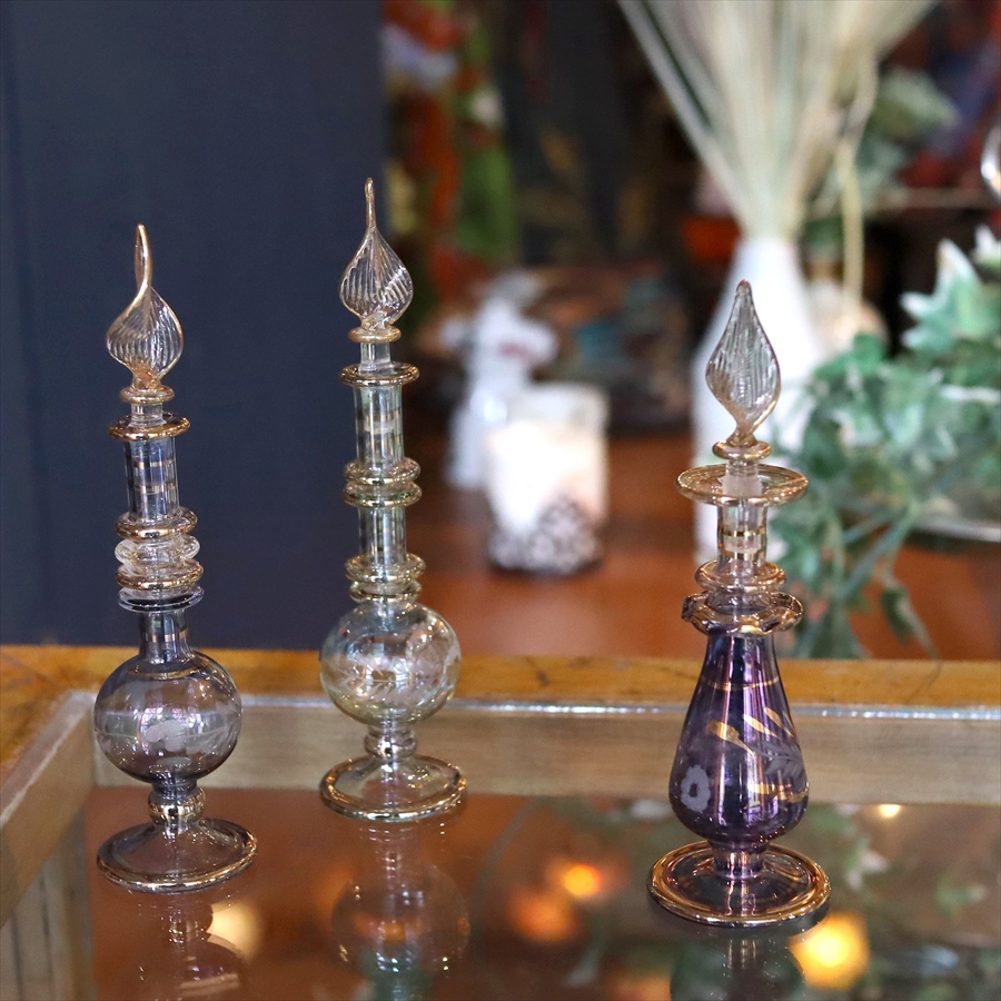 アラビアンな輝きの香水瓶。約12cmの高さのミニサイズ3本セットです。エジプトのカイロにて職人さんが一つ一つ手作りで作っているので、カラーやデザインのバリエーションも様々です。