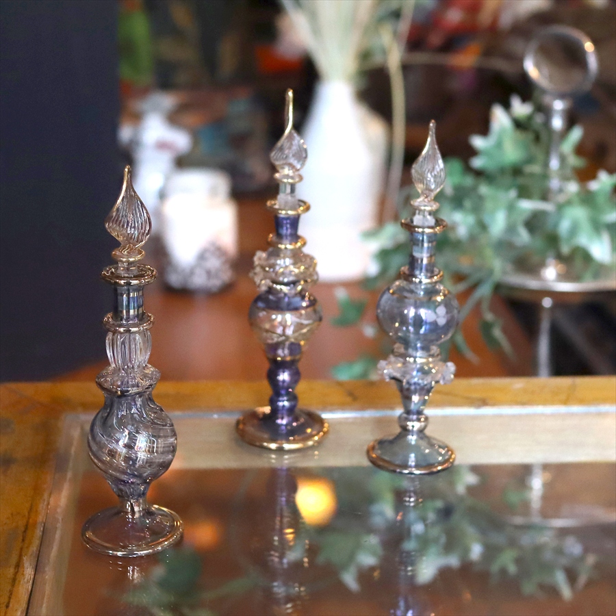 アラビアンな輝きの香水瓶。約12cmの高さのミニサイズ3本セットです。エジプトのカイロにて職人さんが一つ一つ手作りで作っているので、カラーやデザインのバリエーションも様々です。
