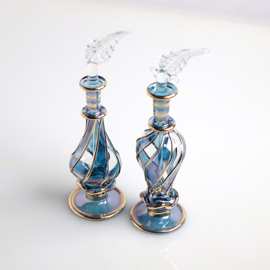 5. エジプト ガラス香水瓶 11cm 2本セット ゴールドライン ファラオ ユニークなボトルキャップ