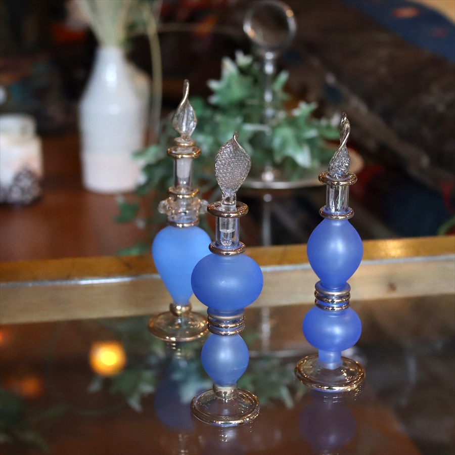 アラビアンな輝きの香水瓶。約12cmの高さのミニサイズ3本セットです。エジプトのカイロにて職人さんが一つ一つ手作りで作っているので、カラーやデザインのバリエーションも様々です。