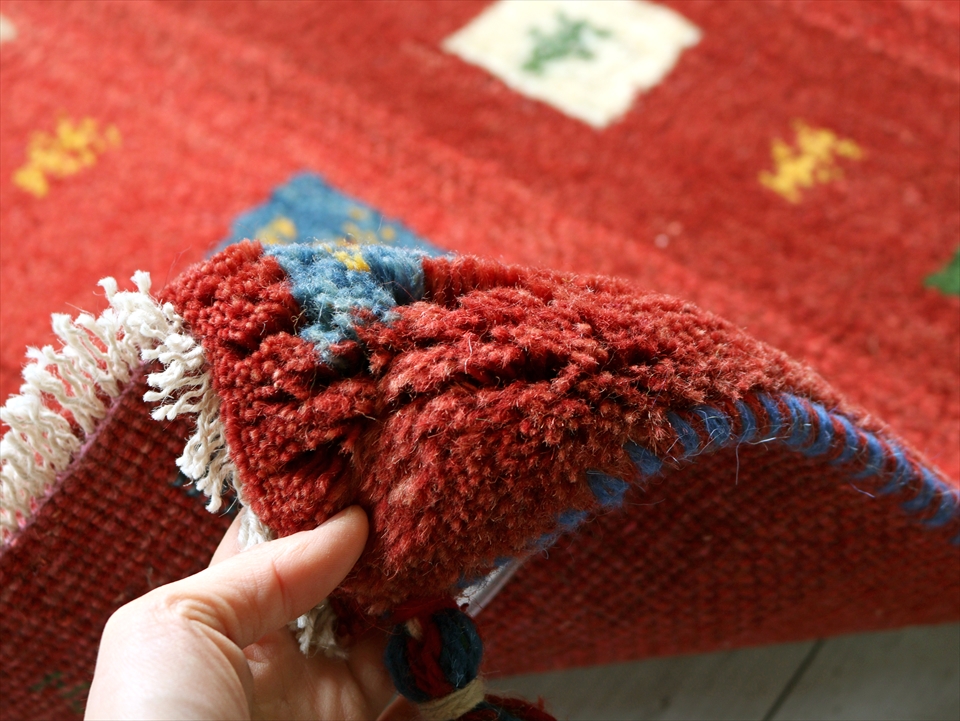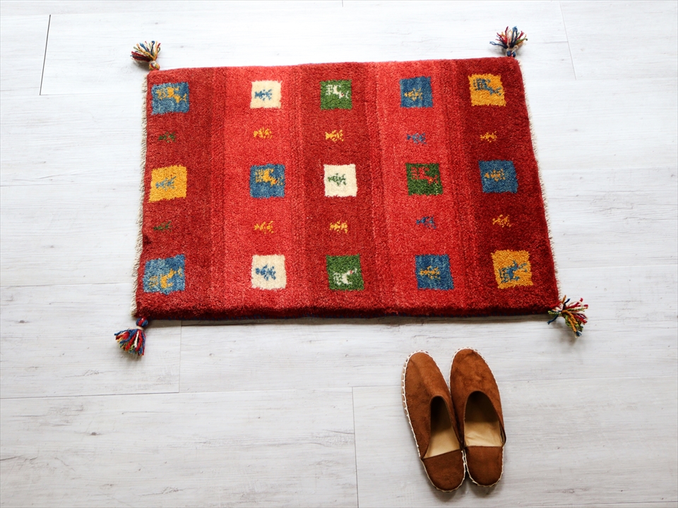 ギャッベ 手織りラグ イラン製 ウール100% 玄関マットサイズ85×60cm レッド ボーダーストライプ 動物と植物モチーフ