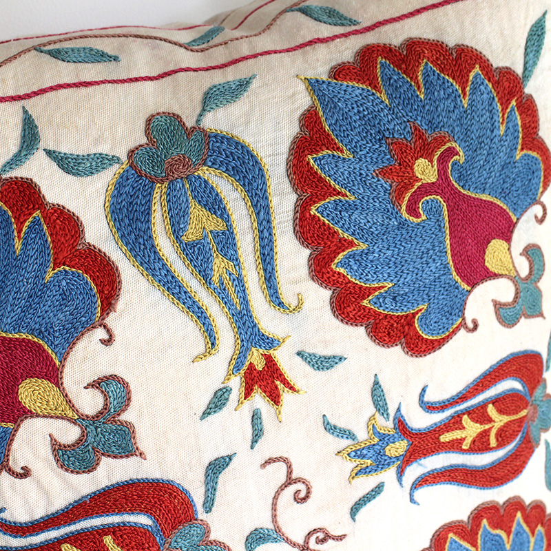 ウズベキスタンの伝統の手刺繍布・スザンニをクッションカバーに仕立てました。緻密なニードルワークによるチェーンステッチの手刺繍が見事です。