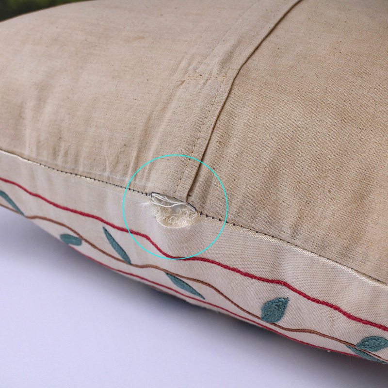 表の中央部分にうっすらとした青の色うつりがあります。ボーダーに1cmほど刺繍がほどけている部分があります。小さなシミ・汚れが数か所あります。裏面全体にシミがあります。表と裏の縫い合わせ部分と、ファスナーの取り付け部分にほつれがあります。