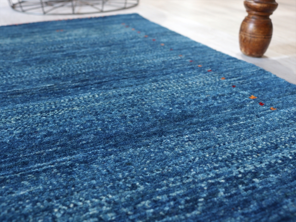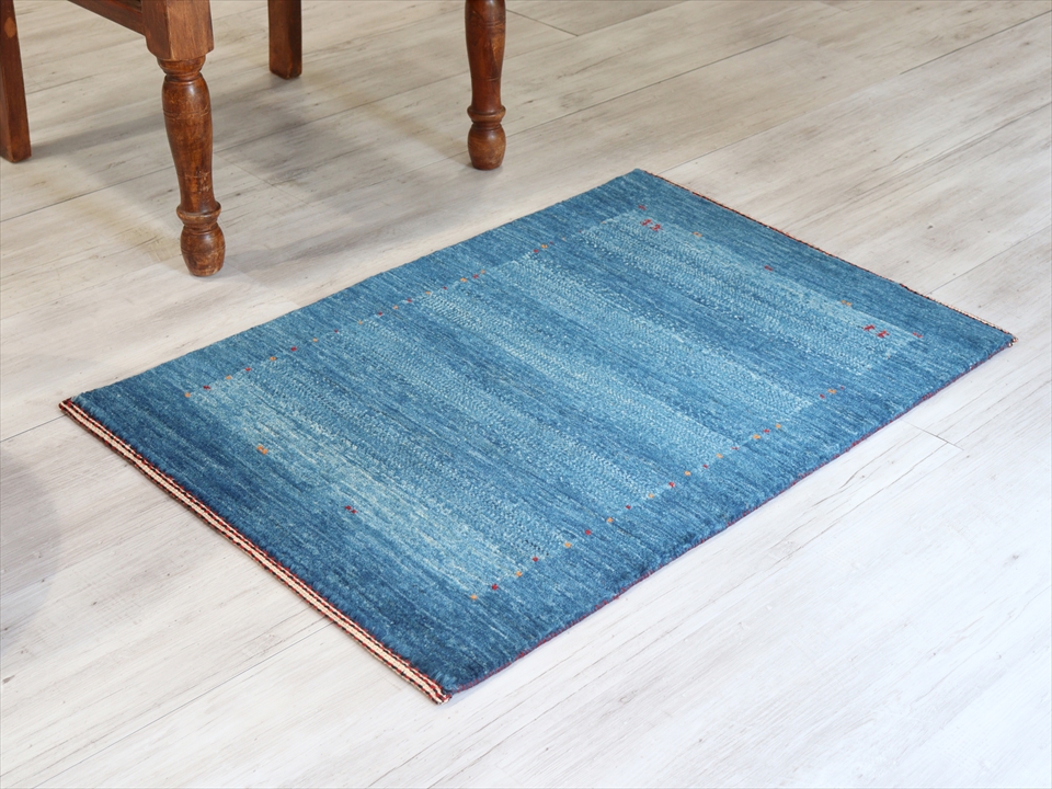 ギャッベ 最上級の織り ロリアタシュ 玄関マットサイズ90×60cm ブルー ボーダー&ドット