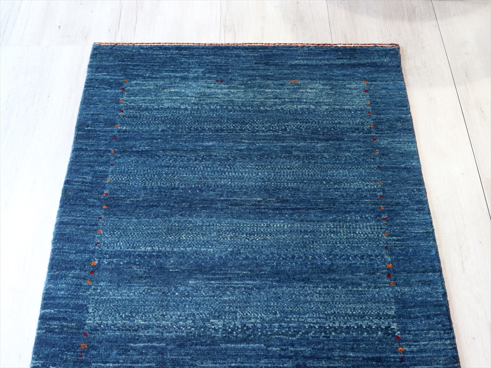 比較的明るめのブルーの濃淡の色の毛糸を使用して、内側はボーダー、外側は枠縁を織ったシンプルで上品デザイン。控えめにはいったドットや小さなモチーフは細かい織りでこそ可能なデザイン。パイル(毛足)の目の方向により、色濃く重厚に見えたり、色鮮やかで明るく見えたりと印象が異なるのも、織り目の細かな最上級のギャベです。