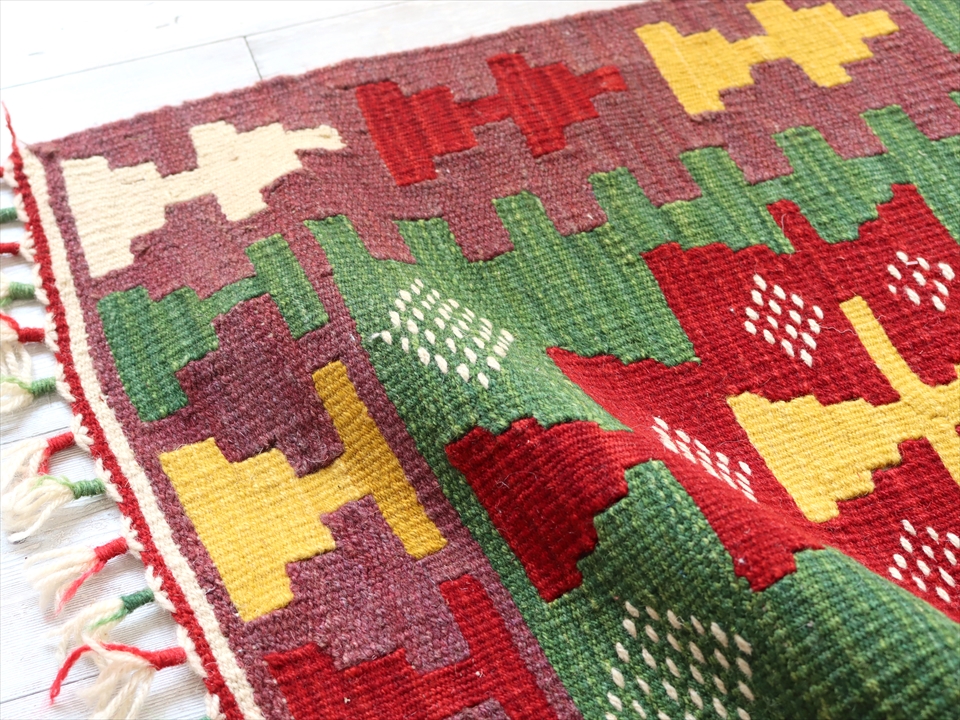 やわらかくしなやかな織り地。厚みは、キリムとしては標準的でおよそ5mm弱の薄手の平織りの敷物です。色の切替部分は、キリムの織りの特徴で、縦に隙間が開いています(スリットと呼んでいます)。