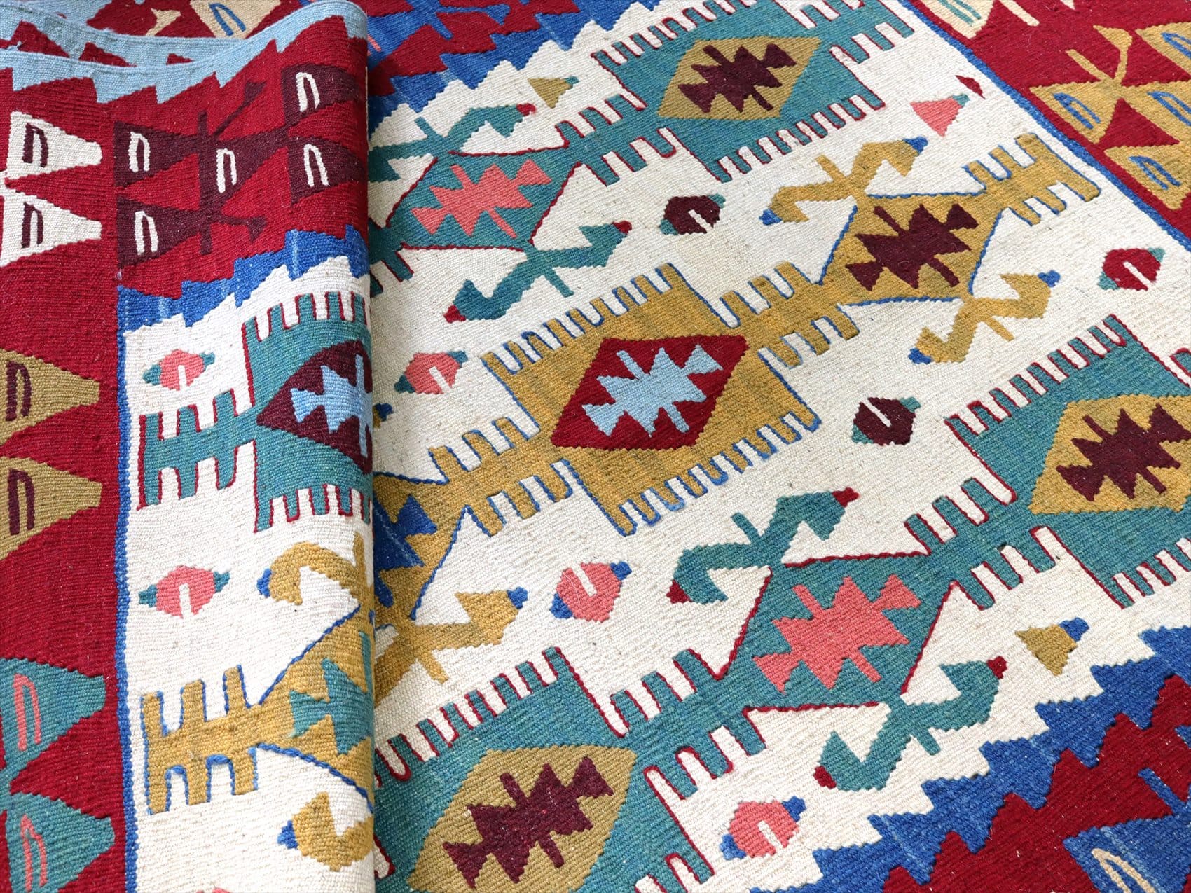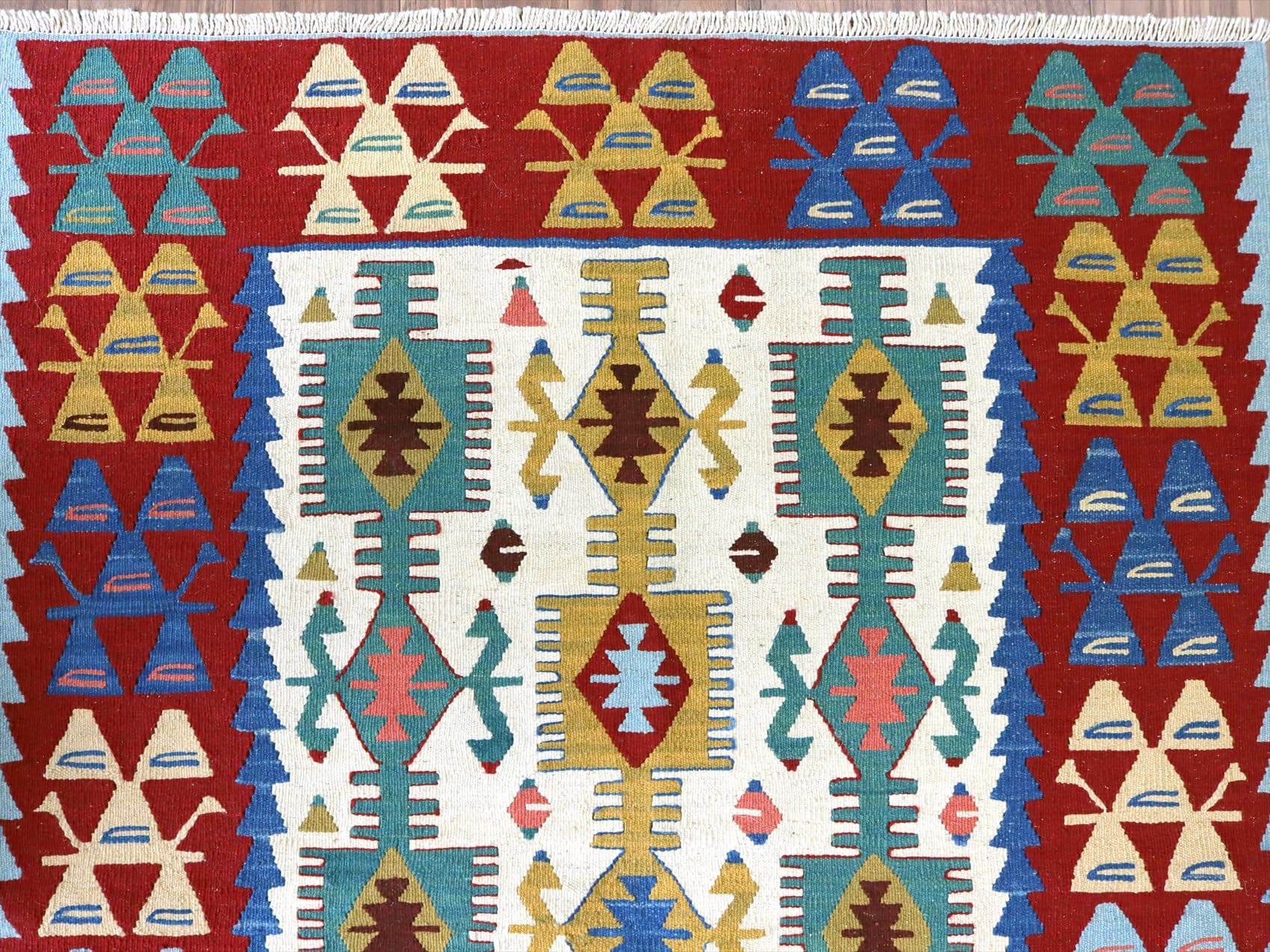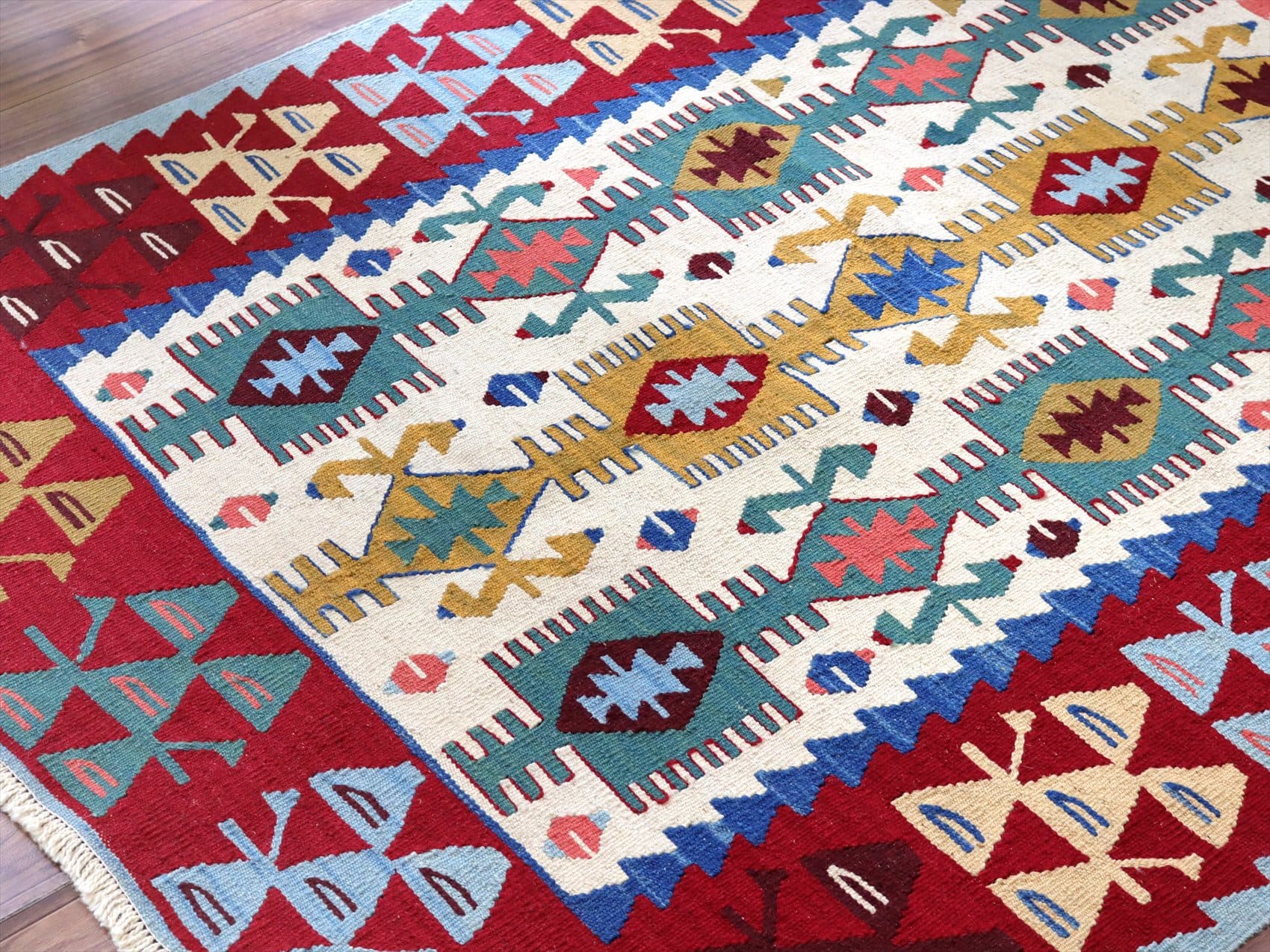 発色がよく鮮やかな色使いのウシャクキリム。ボーダーのレッドが力強く、引き締まったデザインに。