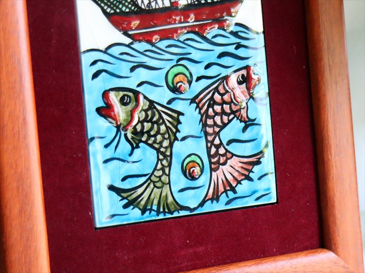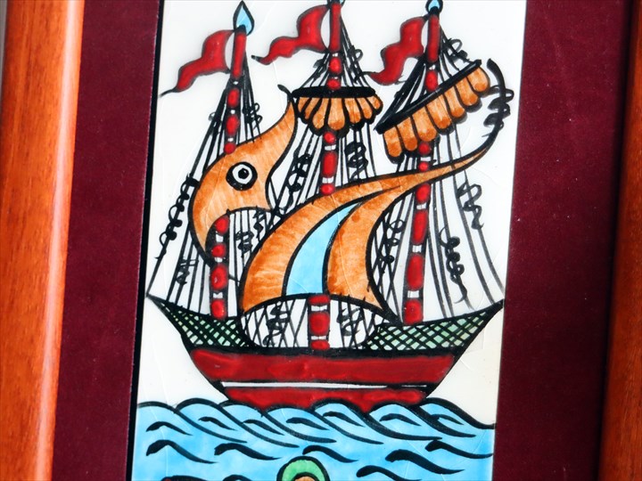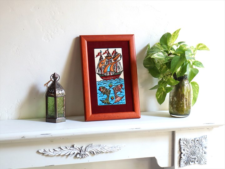 【15%OFF】手書きタイル トルコ陶器 ミニタイル1枚額 H29.5×W19.5×D1.5cm チャナッカレ・トロイの船と魚 Turkish Hand Paint Tile
