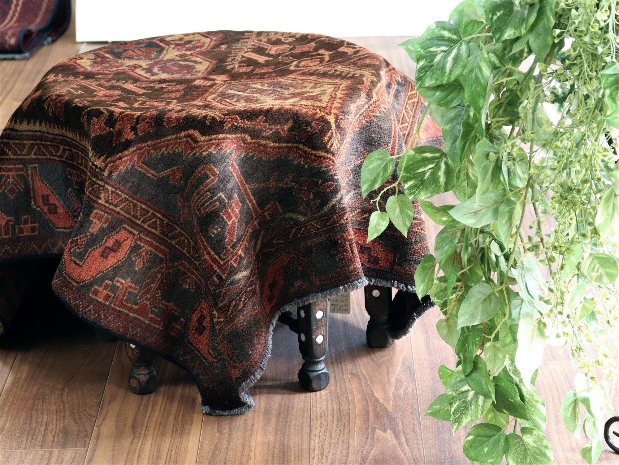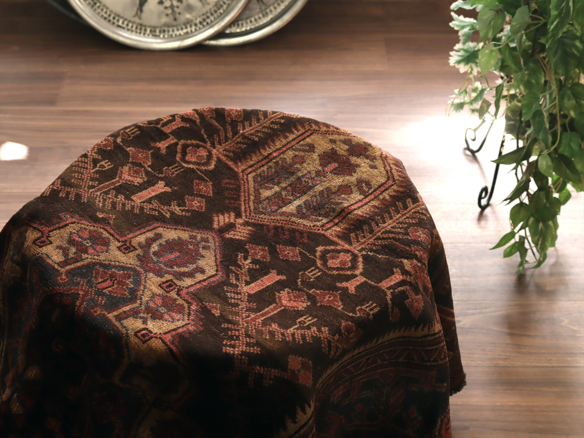 黒に近いダークブラウンをベースに、メダリオンや幾何学モチーフが織られたデザイン。落ち着いた色使いの中に、小花が程よい存在感を主張しています。また、ベースのブラウンが途中からグレーに色が切り替わっている点もユニークです。