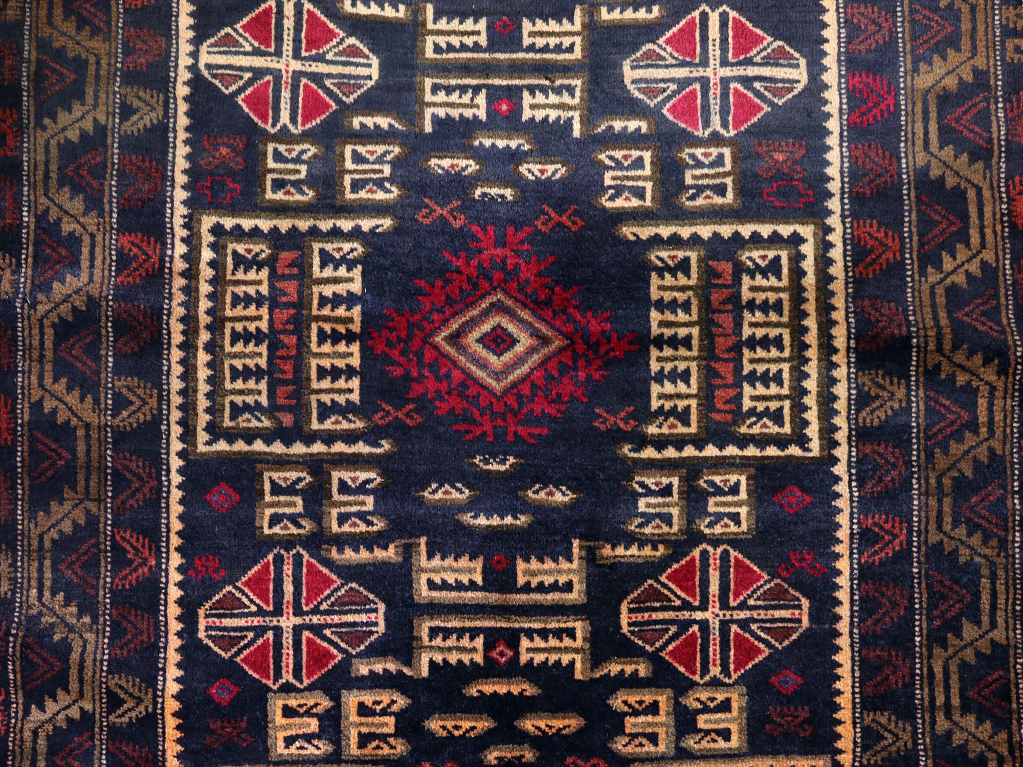 トライバルラグ バルーチ206×121cm 幾何学模様とメダリオン ネイビー