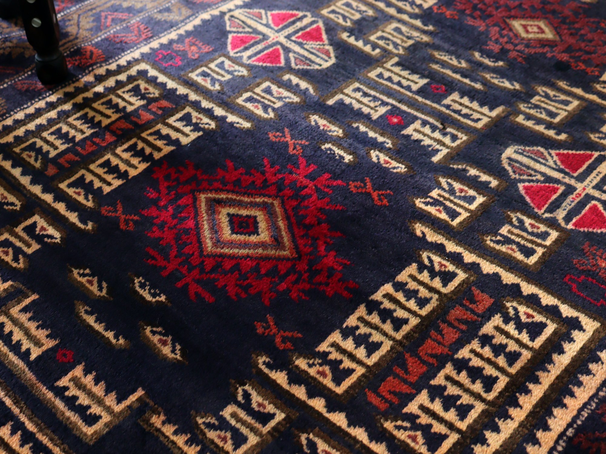 ベースを含めたラグの厚みは8mm程で、ふっくらとした踏み心地です。気にならない程度の小さな修理跡があります。