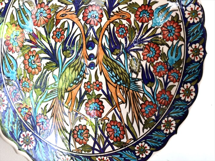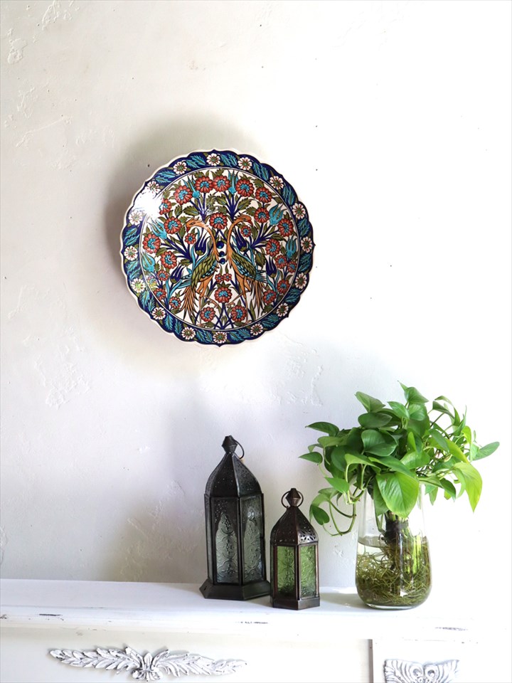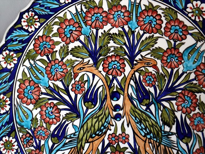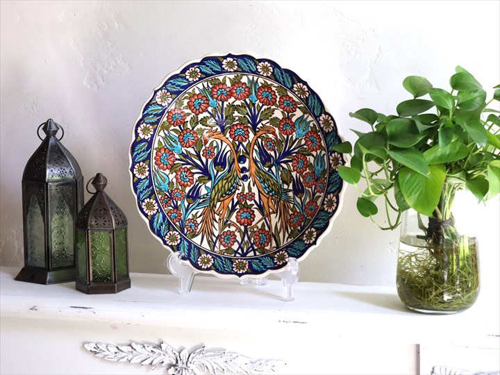 トルコの陶器産業の中心地「キュタフヤ」の工房で手書き絵付けされている飾り皿です。オスマントルコ時代からの伝統を守りつつも、新しいデザインや技術を取り入れた、21世紀の伝統工芸品です。カラフルなフラワーと中央の2匹の孔雀が印象的。