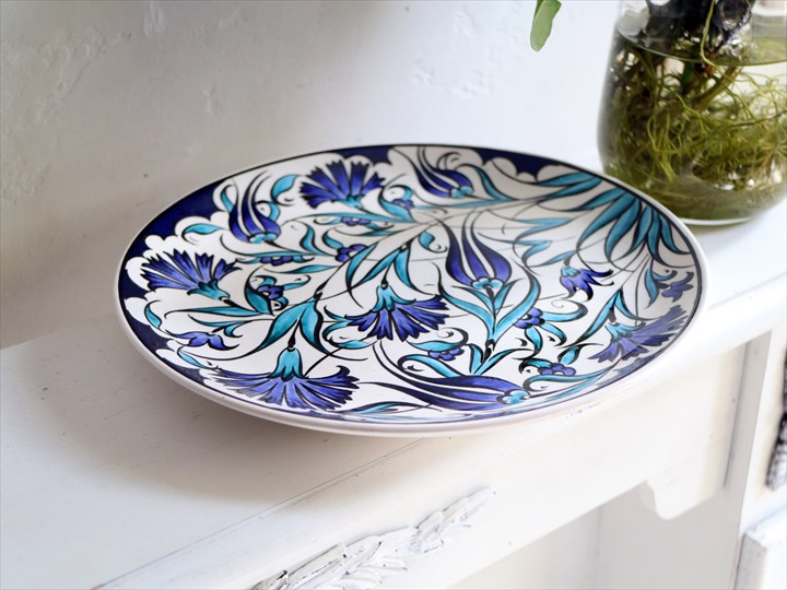 - 手書き絵皿 直径25.5cm トルコ 飾り絵皿 ミュージアムピース オットマンクラシックチューリップとカーネーション ブルーグリーン Turkish Hand Paint Plate
