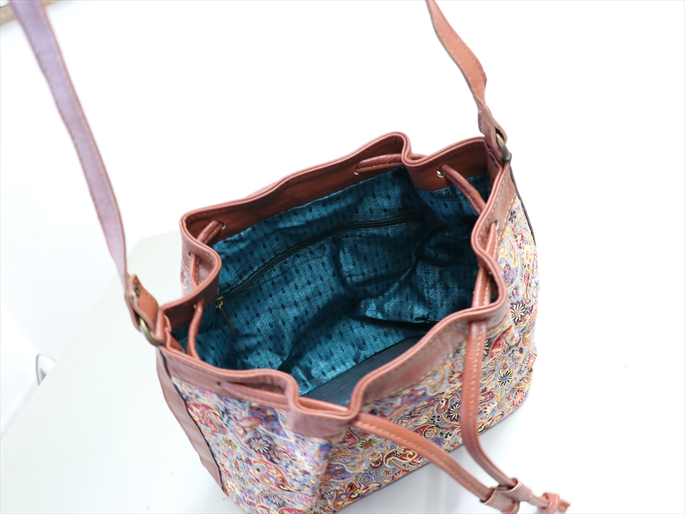 この巾着タイプのショルダーバッグは、イランで織られた布を使って、トルコで縫製されたものです。