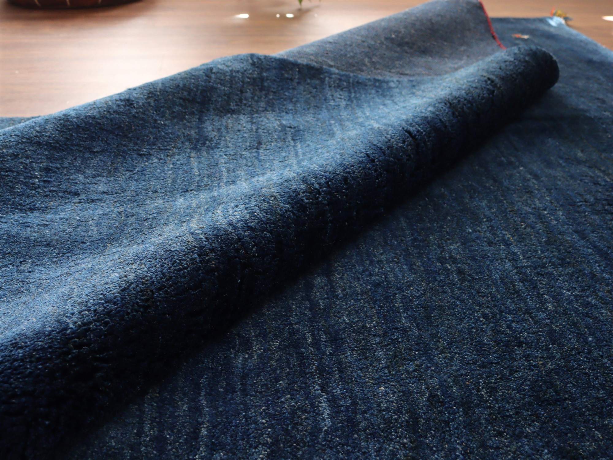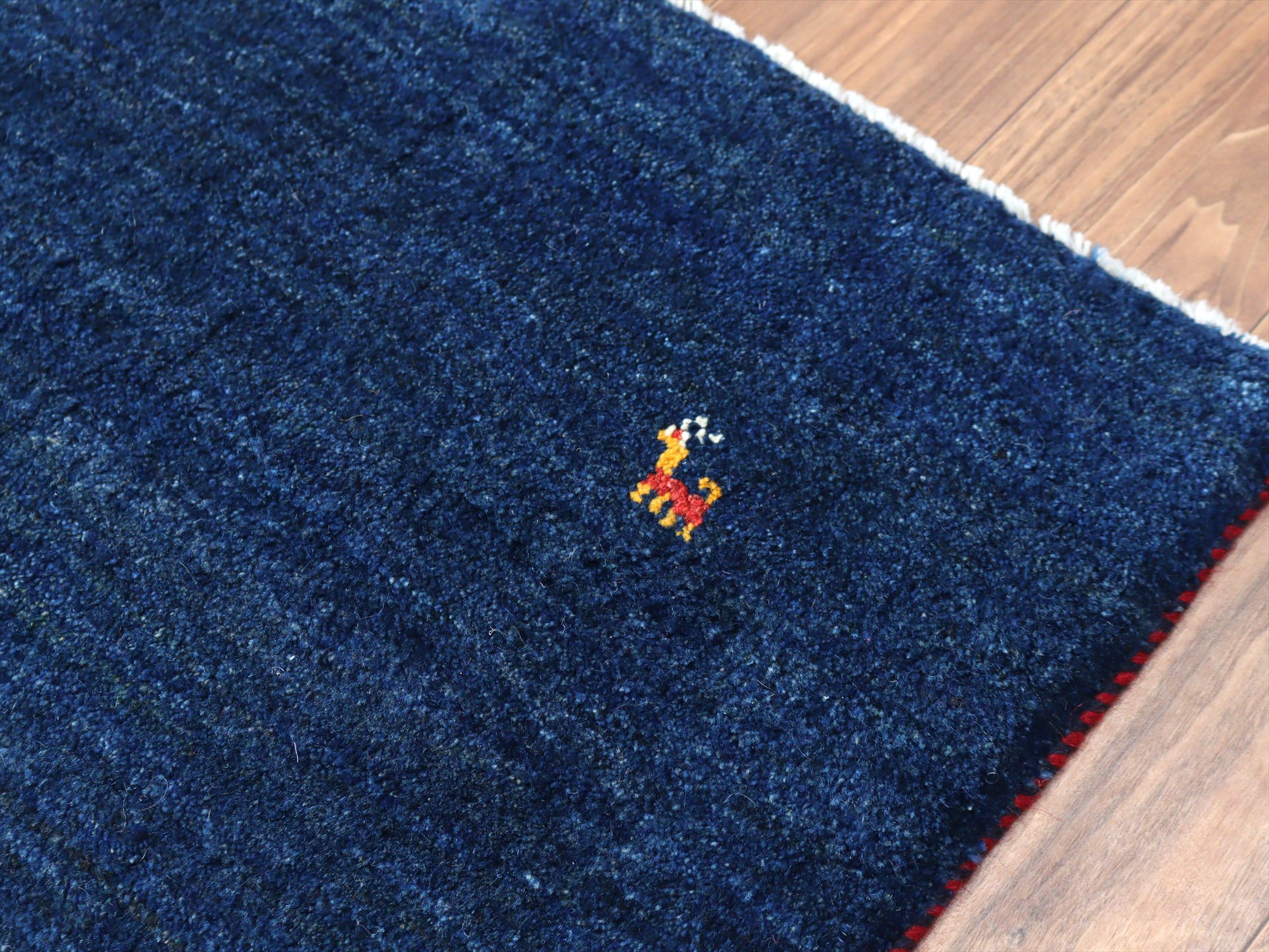 深いネイビーのギャッベ。染めが均一でないため、濃淡のグラデーションがナチュラルに出ていて美しいです。四隅に動物が織られたシンプルなデザイン。