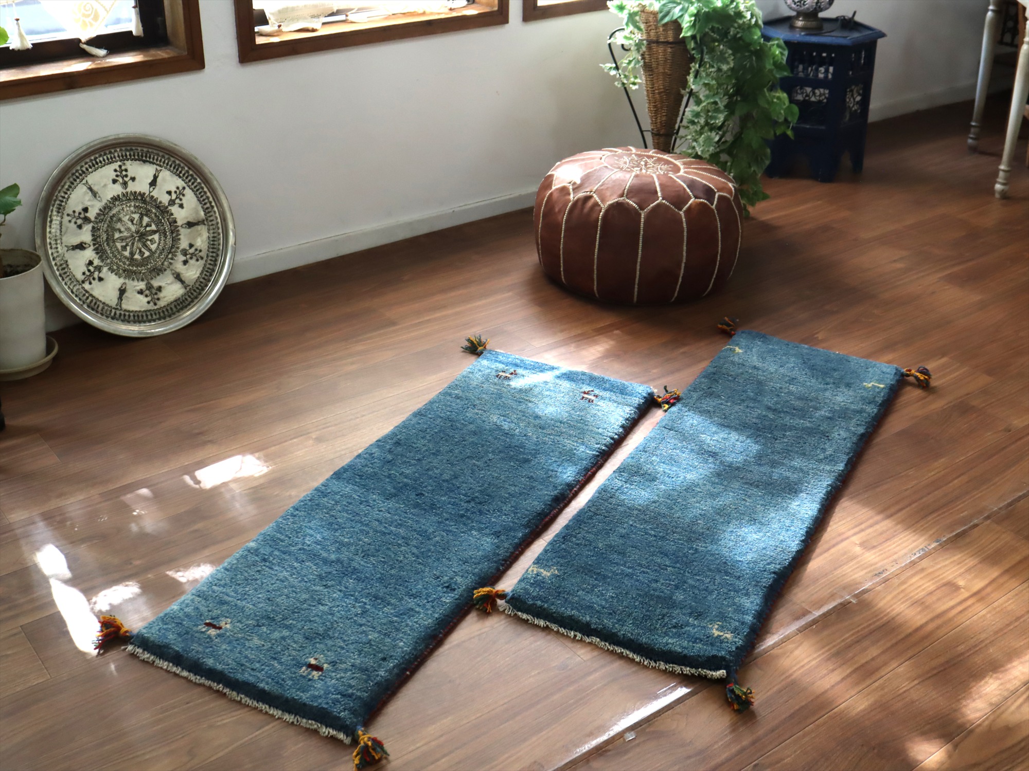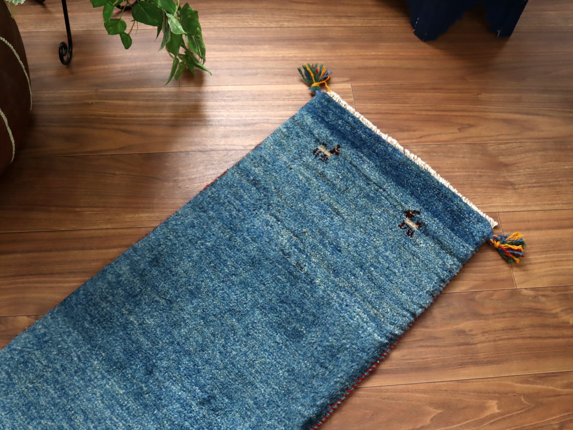 - ギャッベ イラン 手織り ミニランナー 120x42cm ブルー 自然な色ムラ シンプル 無地