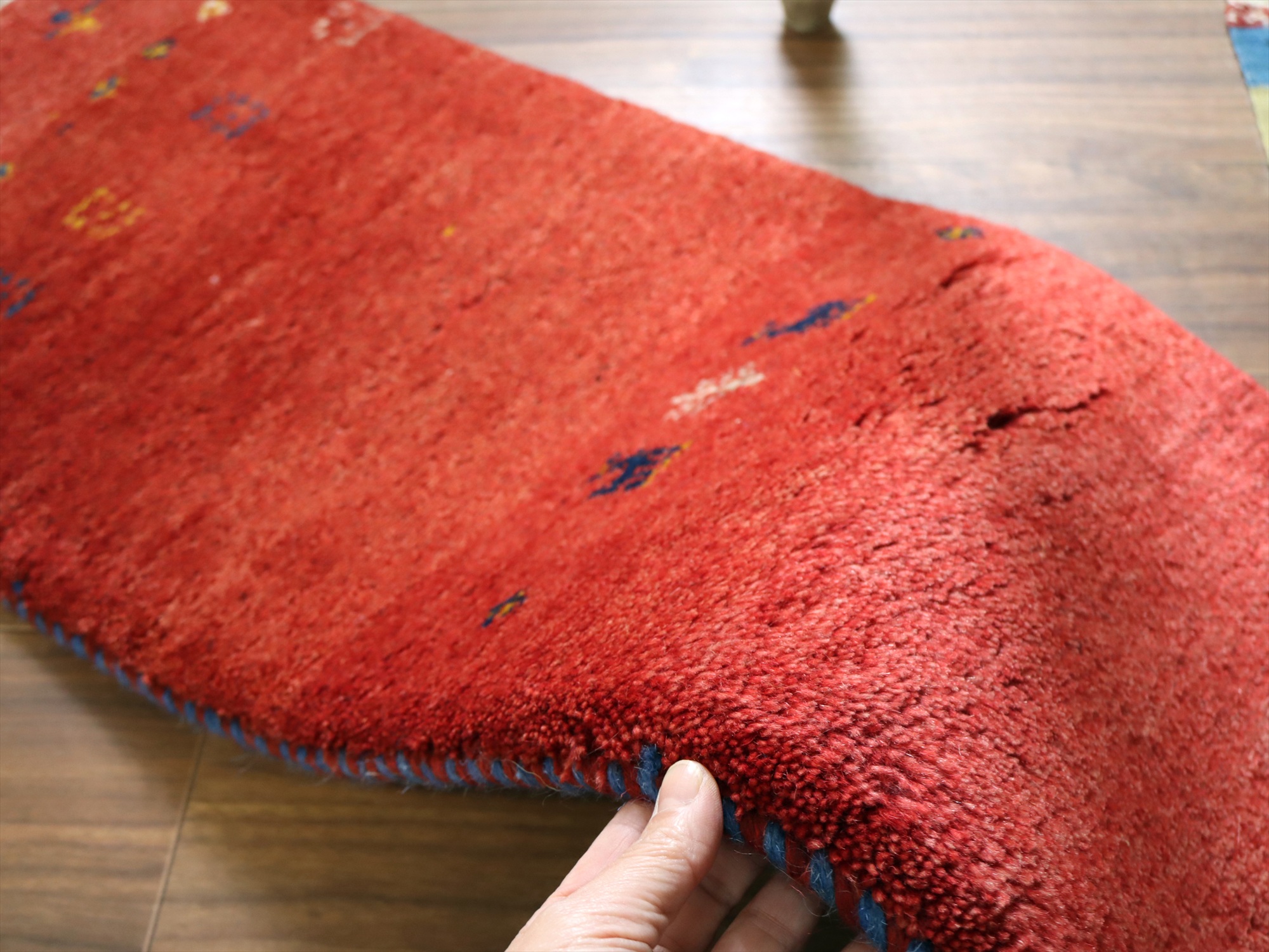 毛足が長くボリュームあるふっくらとした織り地のギャッベ。パイル(毛足)を含めた厚みは2.3-2.4cmほどで、分厚いという表現がぴったりの手織り絨毯です。