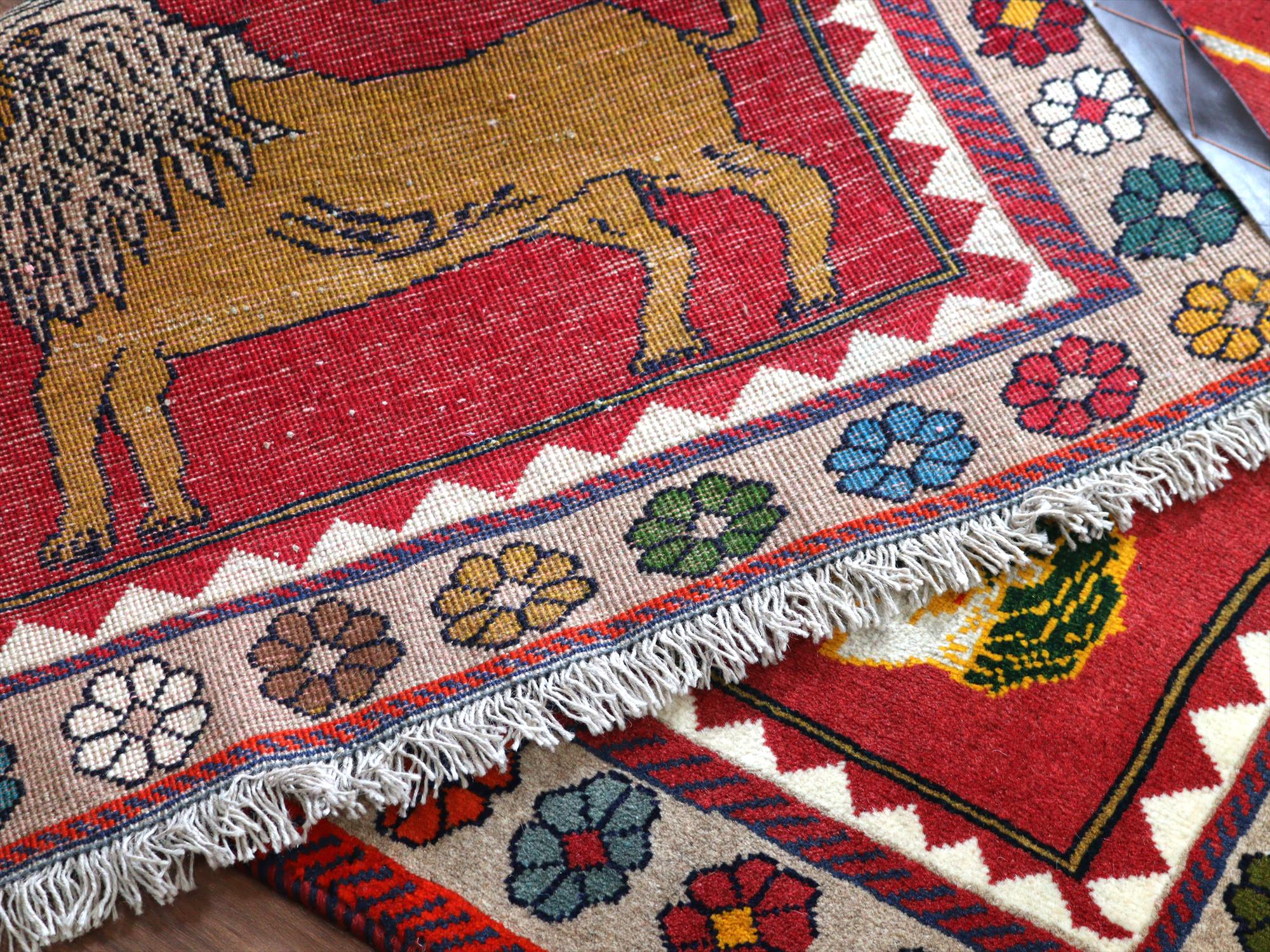 カシュカイ族の象徴とされるライオンのモチーフですが、実際にはすでに絶滅してしまったライオンの姿を想像しながら、織り継がれてきたといいます。オールドライオンギャッベは、もともと販売のためではなく遊牧民たちが自分たちでテント(または部屋)で使うために織られたもの。生活の中で使用されていたものもあれば大切に保管してあったものもあり、状態は様々です。
