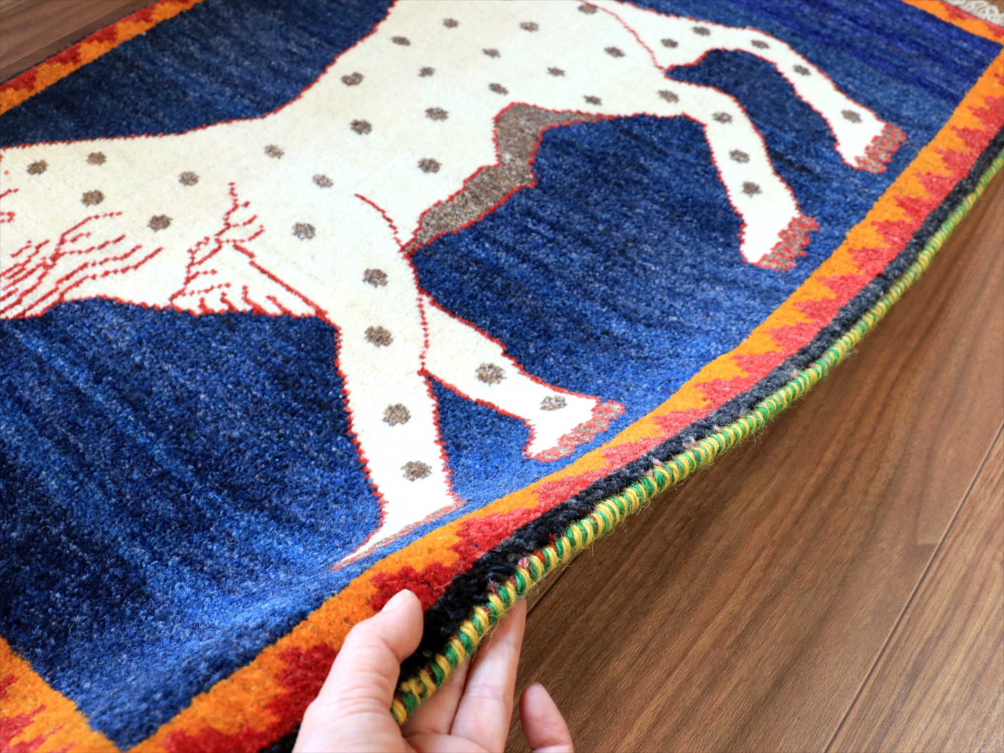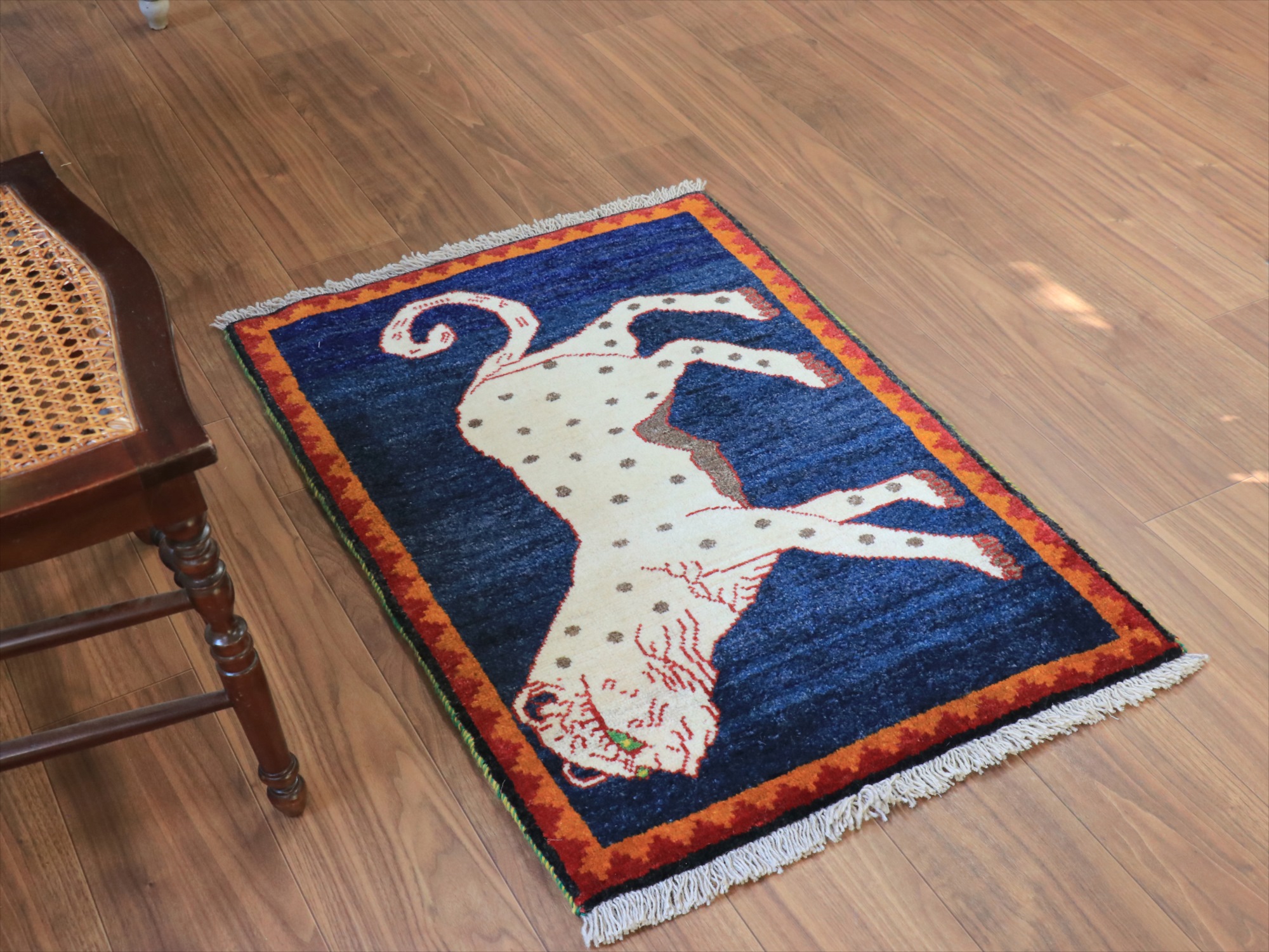 カシュカイ族の象徴でもあるライオンとともに、よく登場するヒョウのデザイン(メスのライオンとも言われています)。発色のよいレッドのフィールドに、ユニークな色使いではありますが、ブルーで織られたヒョウがよく映えます。いろいろなパターンのあるライオンラグの中でも、1頭がシンプルに織り込まれた人気のデザインです。