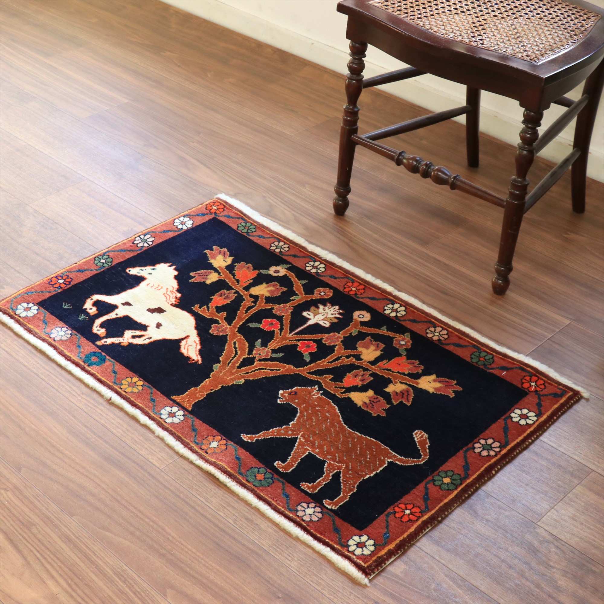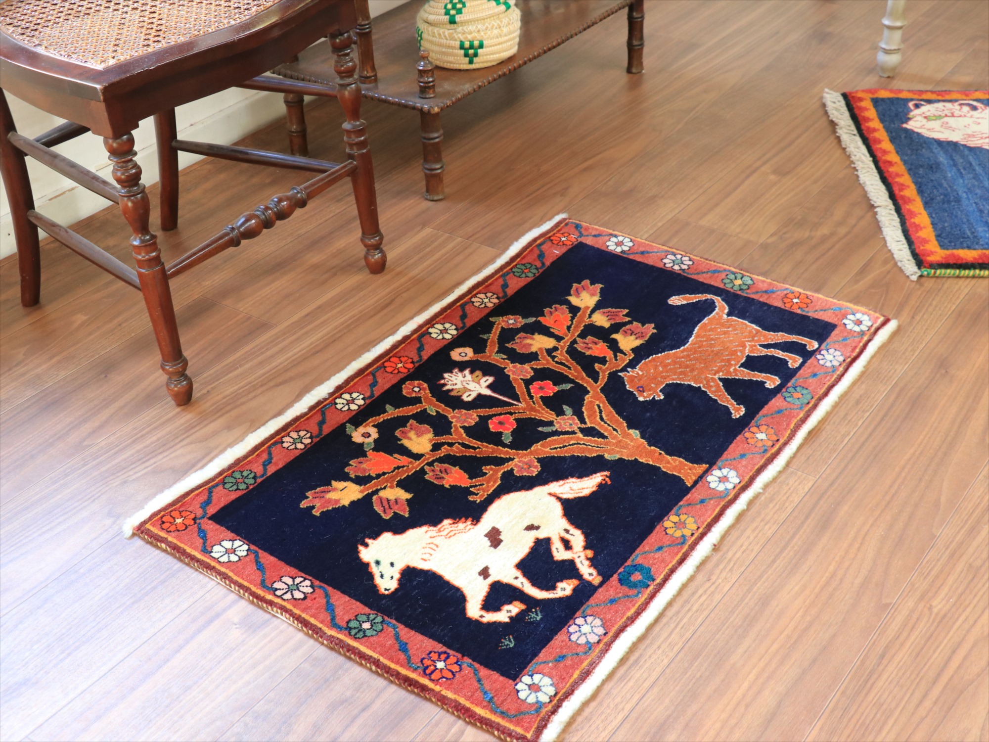 - オールドギャッベ カシュカイ族の手織りラグ 89x53cm 生命の木 馬とライオン