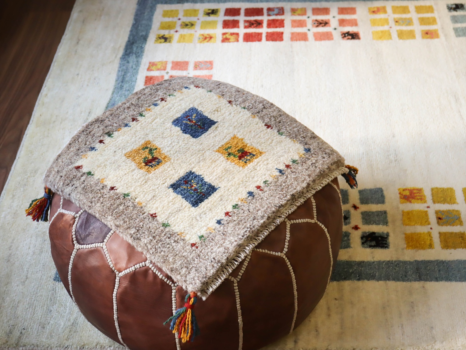 - ギャッベ イラン産手織り 座布団サイズ 42x42cm ナチュラルアイボリー グレー