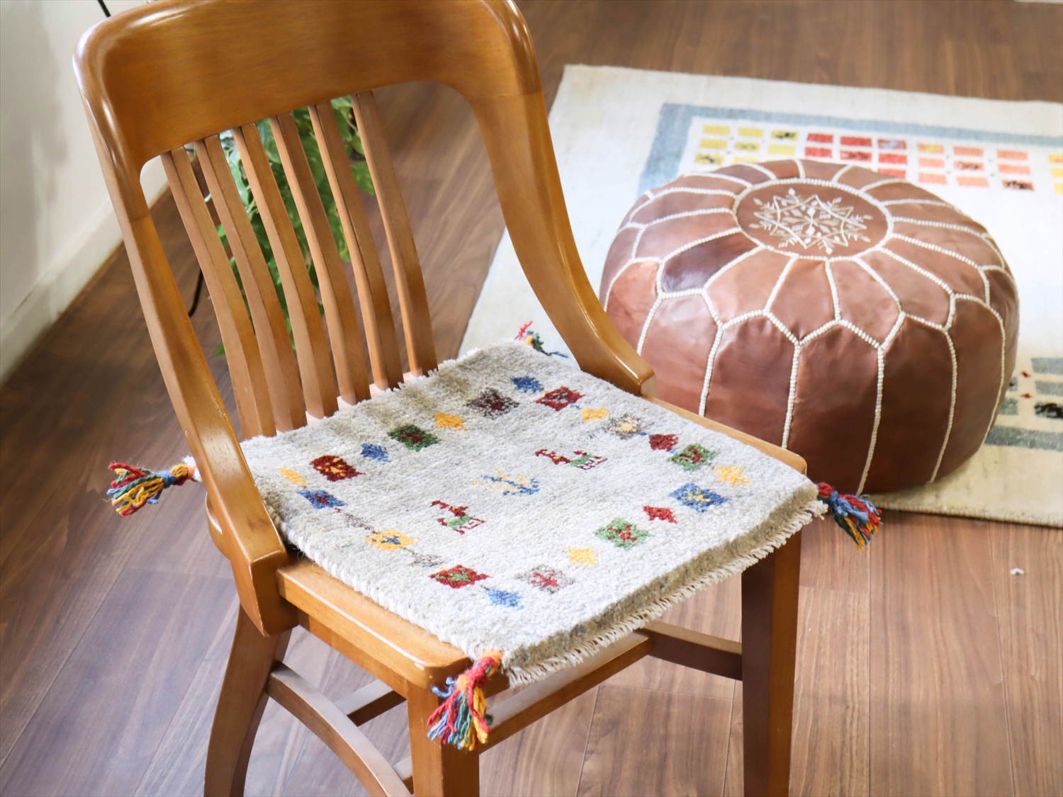 - ギャッベ イラン産手織り 座布団サイズ 42x40cm ライトグレー カラフルなモチーフ