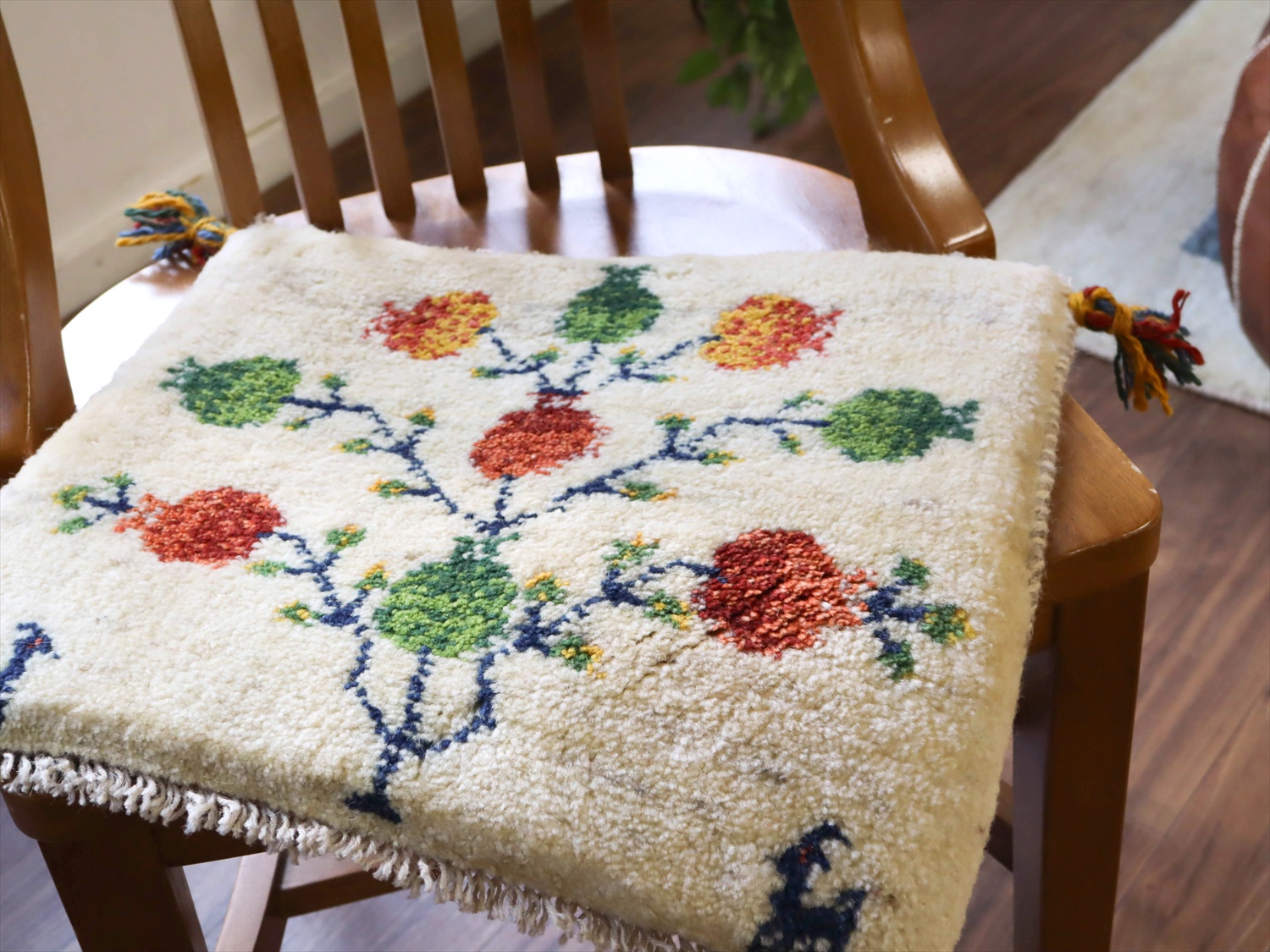- ギャッベ イラン産手織り 座布団サイズ 37x43cm ナチュラルアイボリー ザクロの実