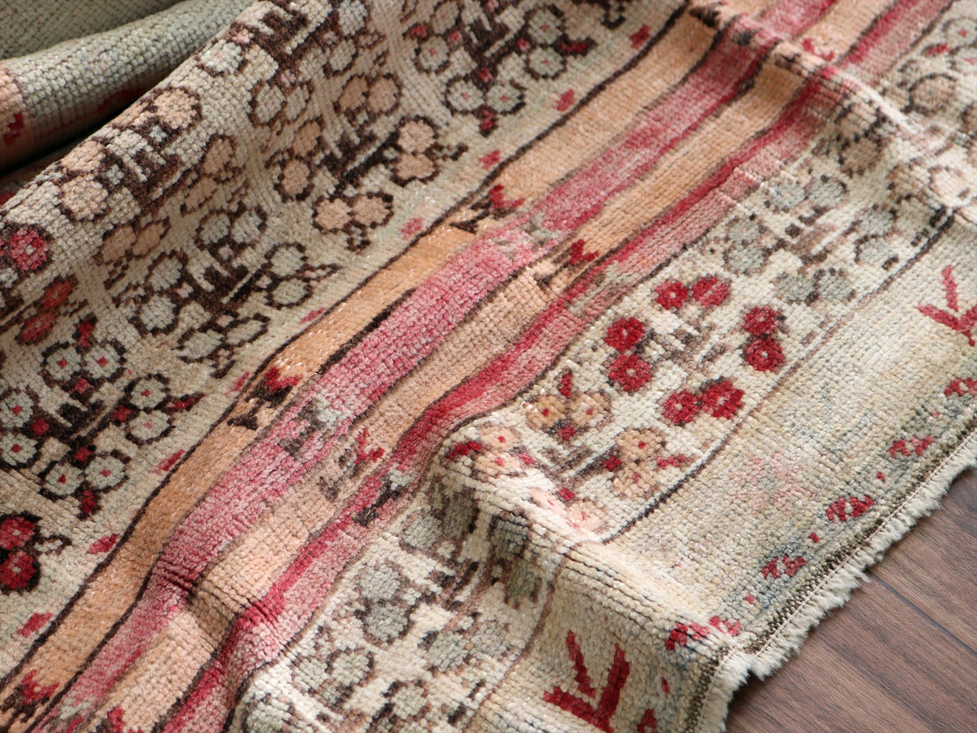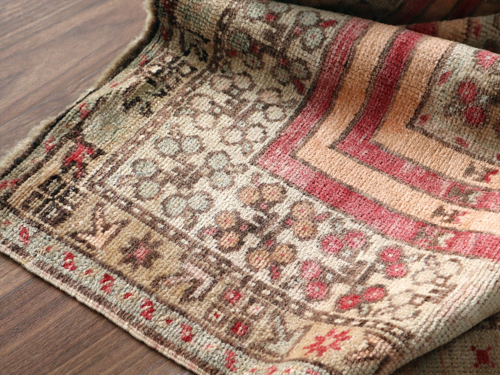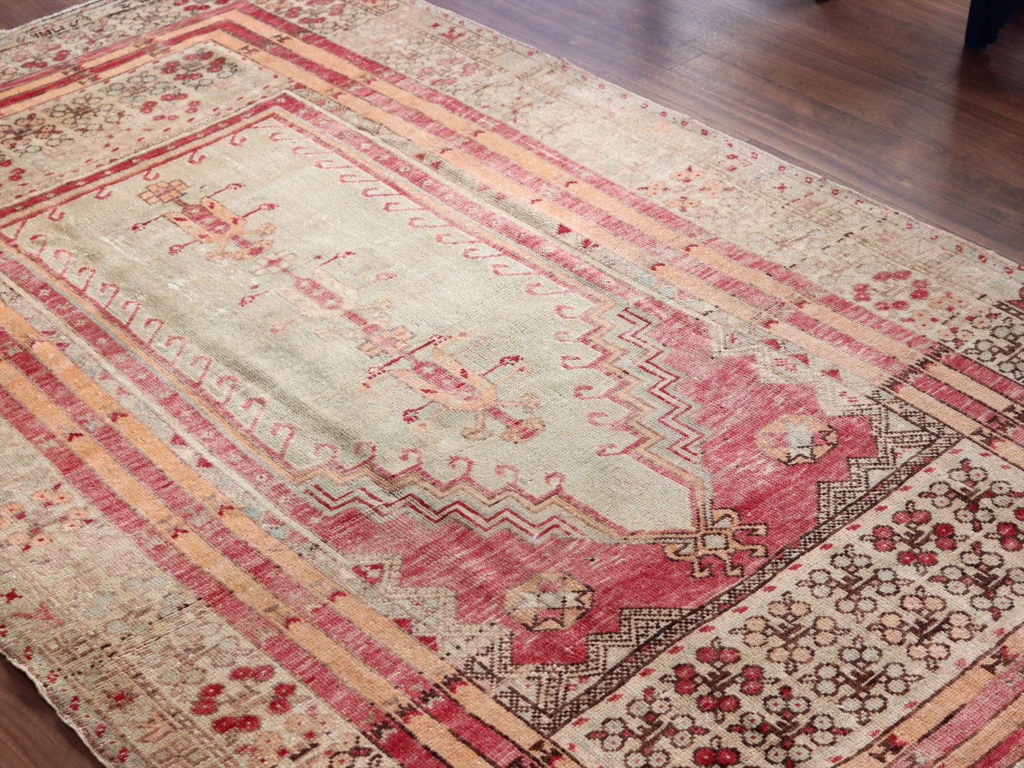 グリーン、レッド、オレンジを基調とした色使いで、ミフラープ(お祈りの方向を示すくぼみ)が織られています。日焼けして色褪せたのか、ブリーチによるものなのかは定かではありませんが、だいぶ落ち着いた色合いになりました。特に、グリーンの部分は色褪せたことにより、グレーがかった緑のようにも見えます。