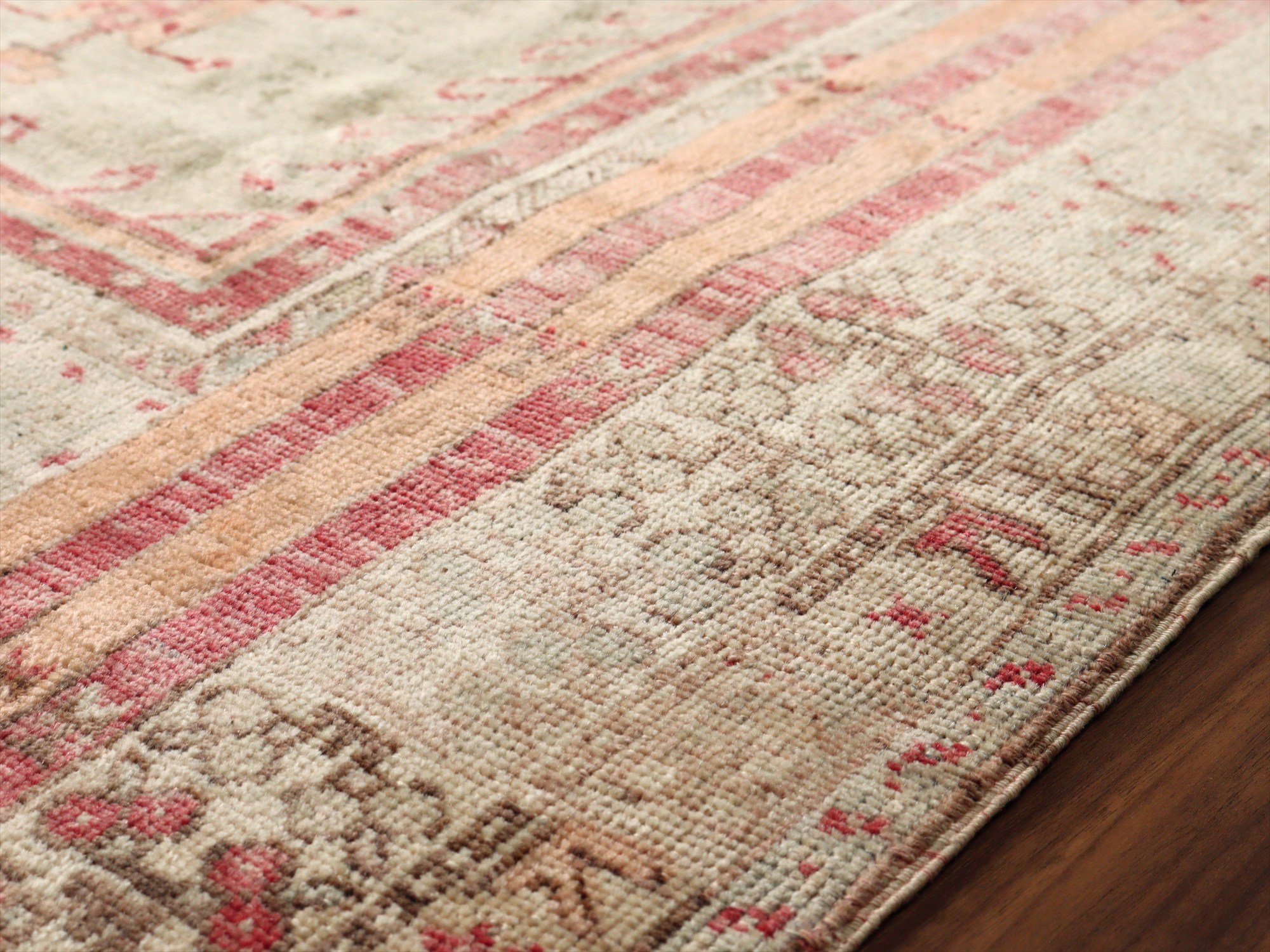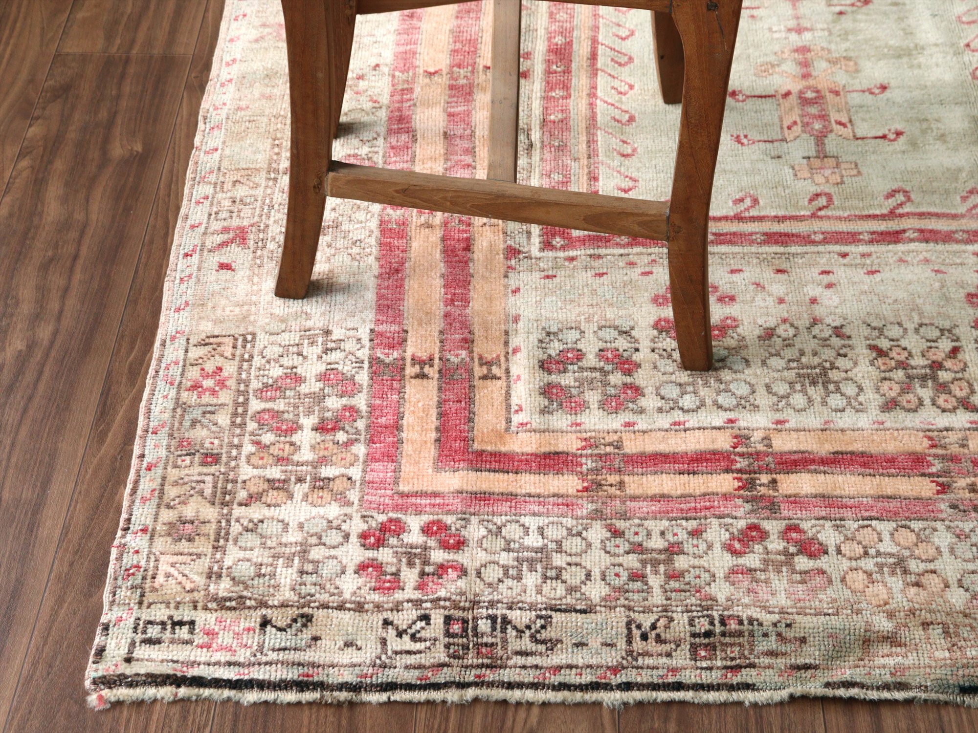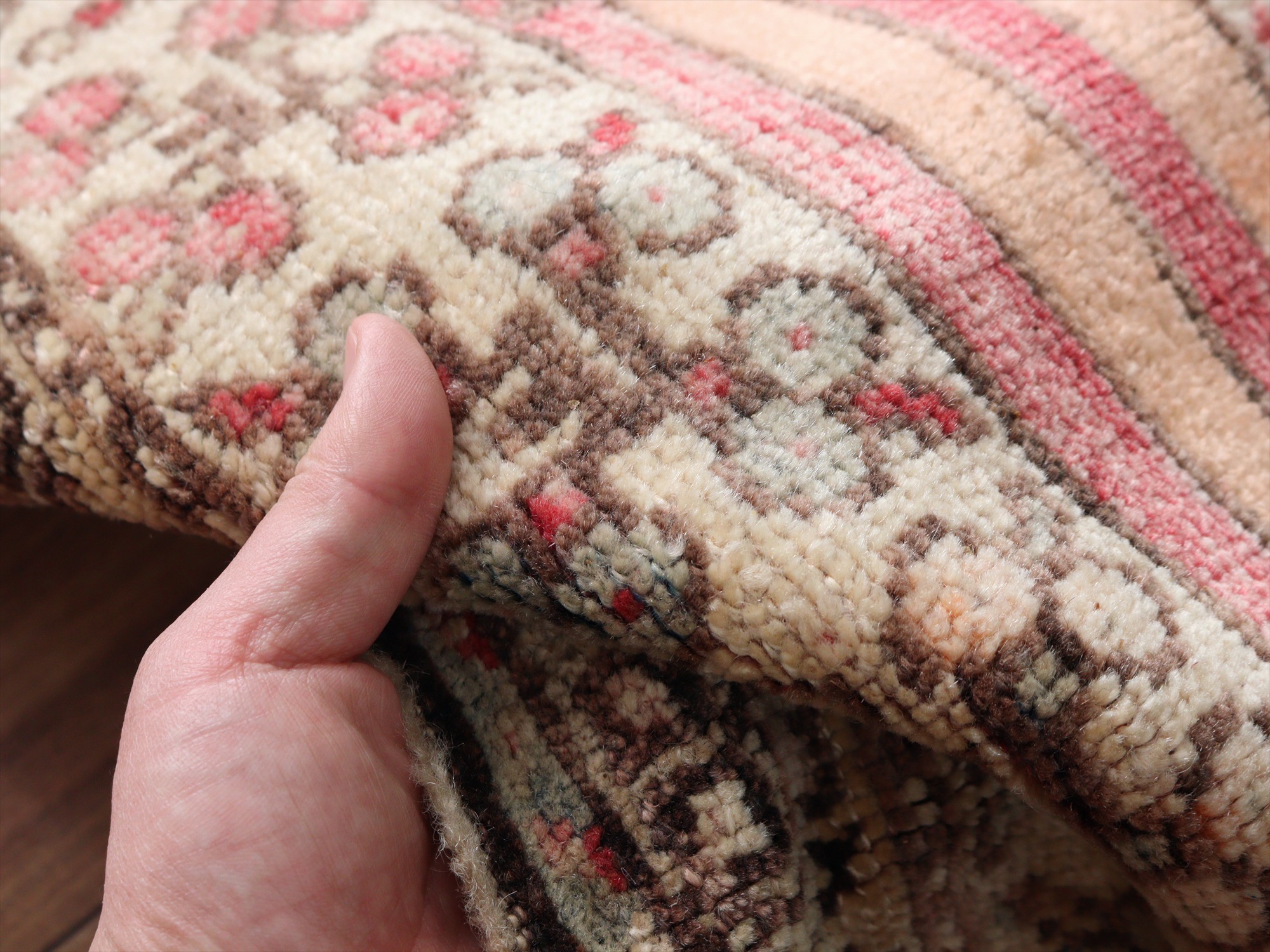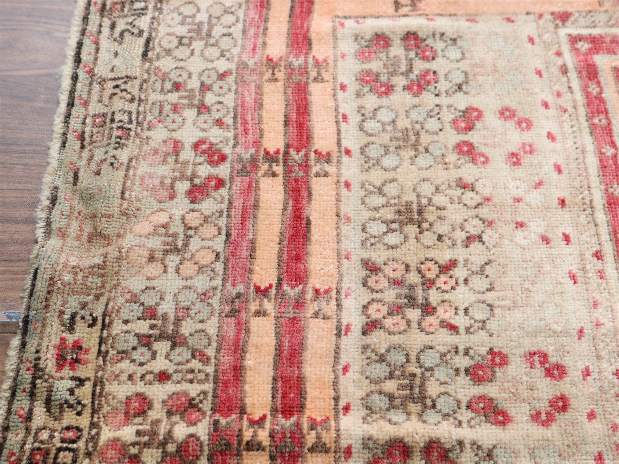 グリーン、レッド、オレンジを基調とした色使いで、ミフラープ(お祈りの方向を示すくぼみ)が織られています。日焼けして色褪せたのか、ブリーチによるものなのかは定かではありませんが、だいぶ落ち着いた色合いになりました。特に、グリーンの部分は色褪せたことにより、グレーがかった緑のようにも見えます。