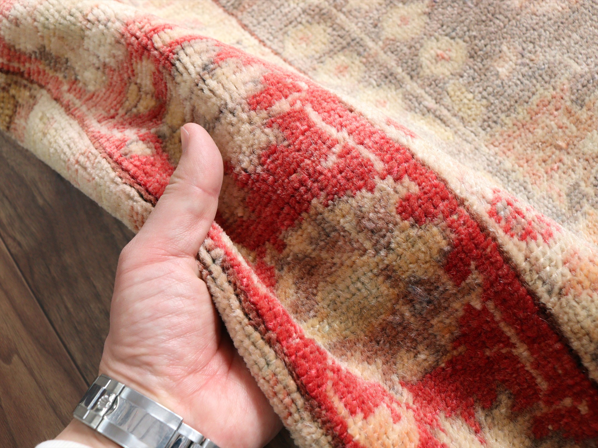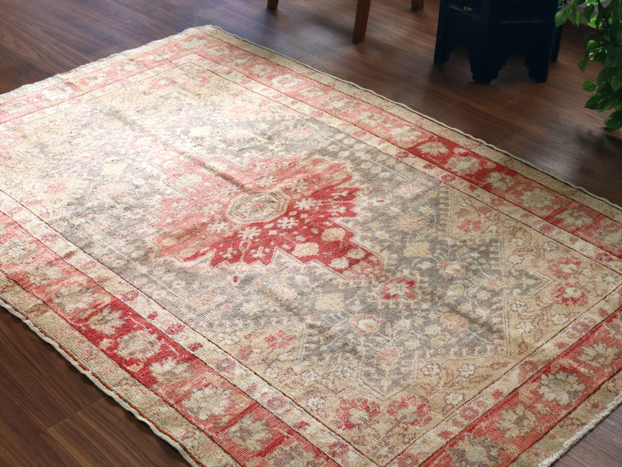 中央にレッドとネイビーの組み合わせでメダリオンがおかれ、その周りと枠部部分には小花が連なるように織られたクラシカルで上品なデザイン。色褪せたことにより、ネイビーの部分はグレーがかって見えます。
