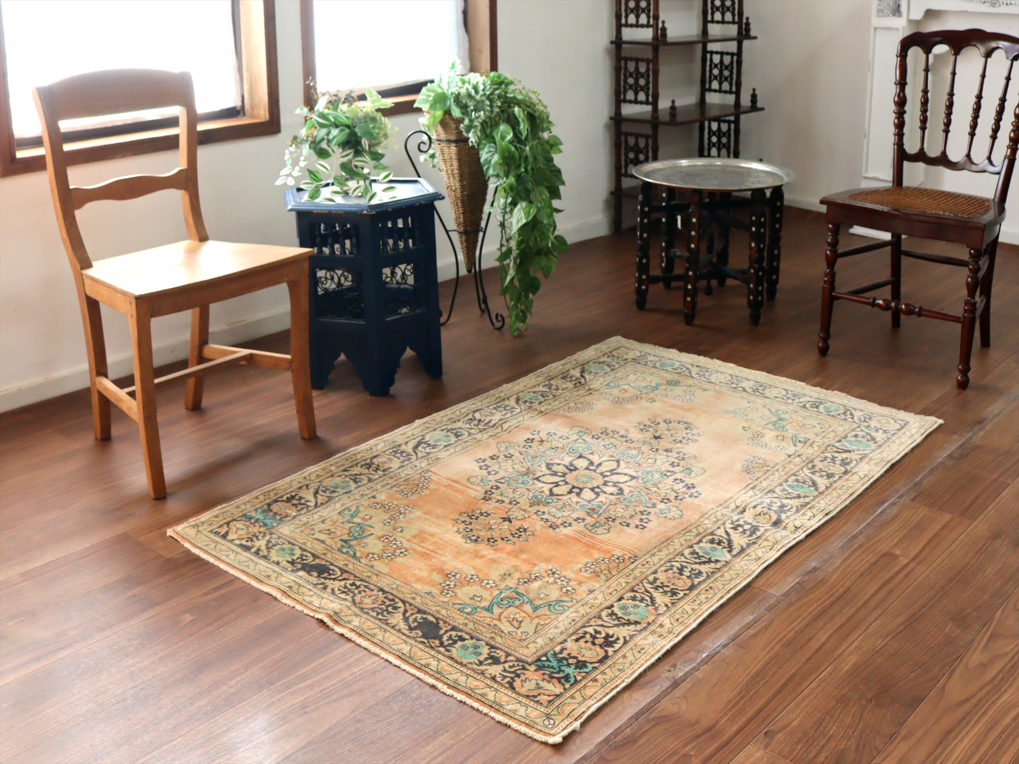 オールドカーペット パステルカラー148×95cm 花形のメダリオン ヴィンテージラグ