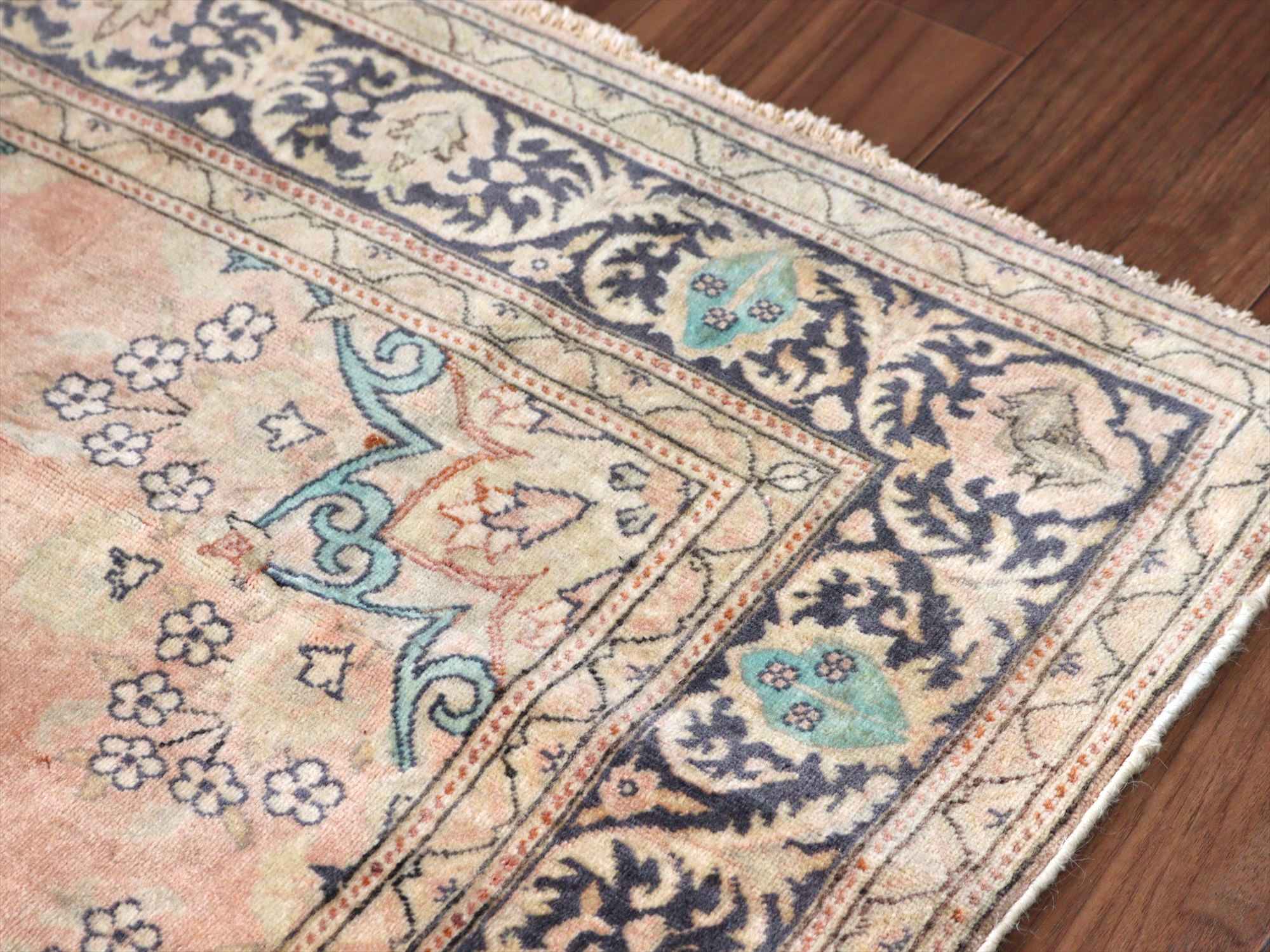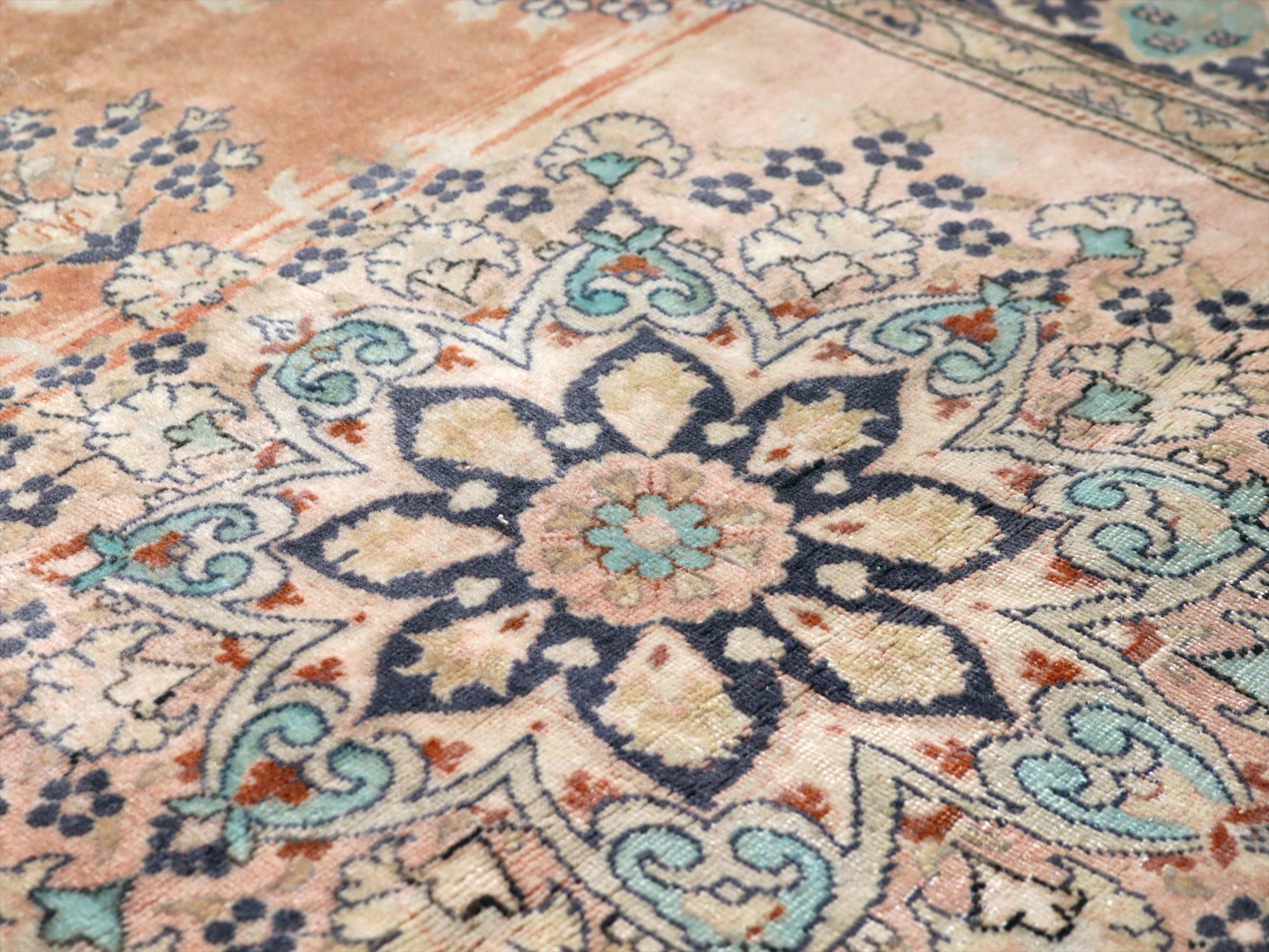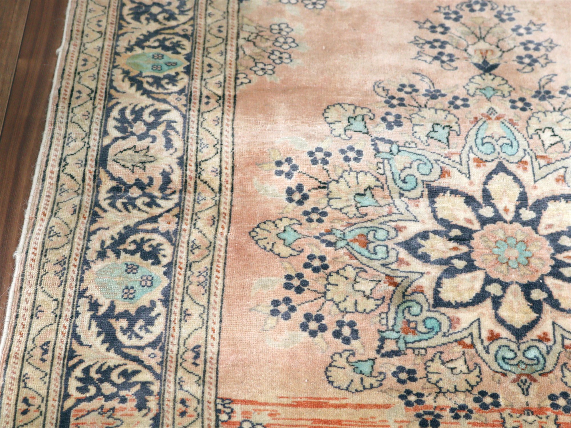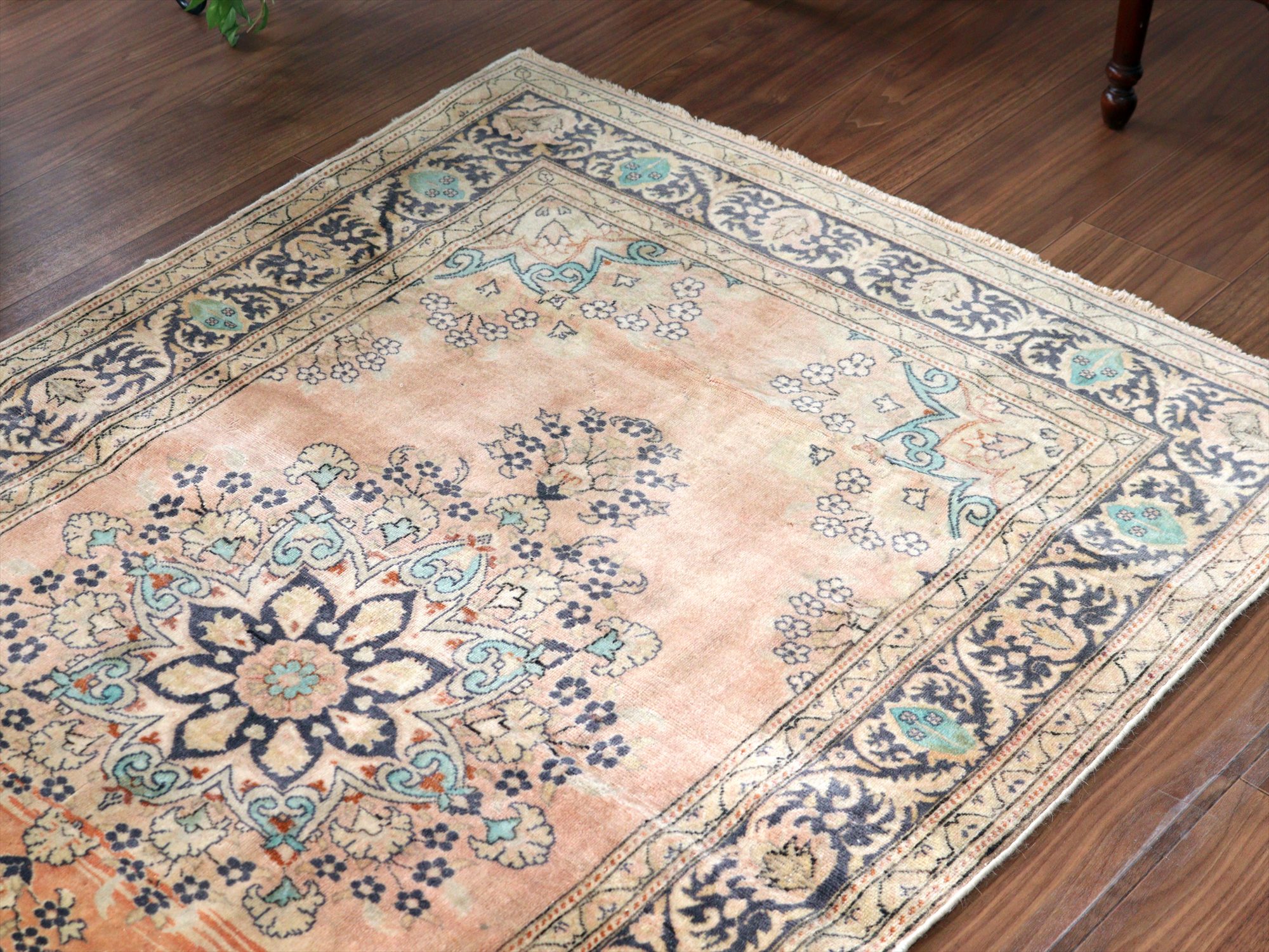 もともとレッドとベージュ基調で織られていたと考えられますが、だいぶ色褪せたことによりパステルカラーに落ち着いています。中央には花形のメダリオン、額縁部分にも花が連なるように描かれた華やかなデザインです。