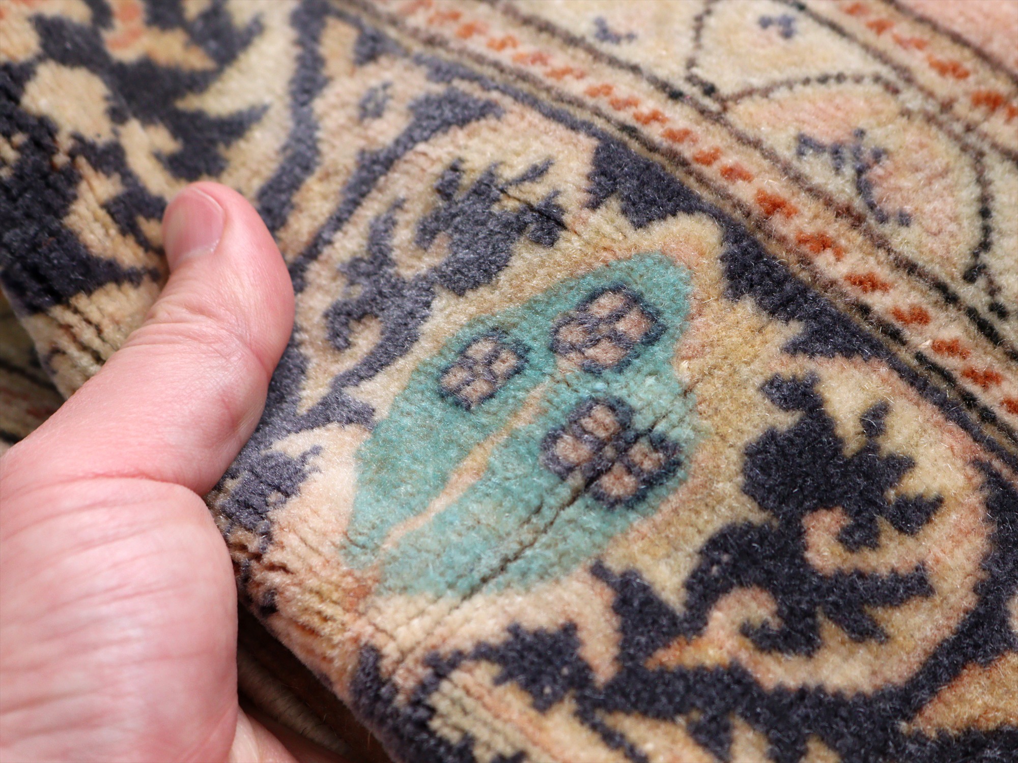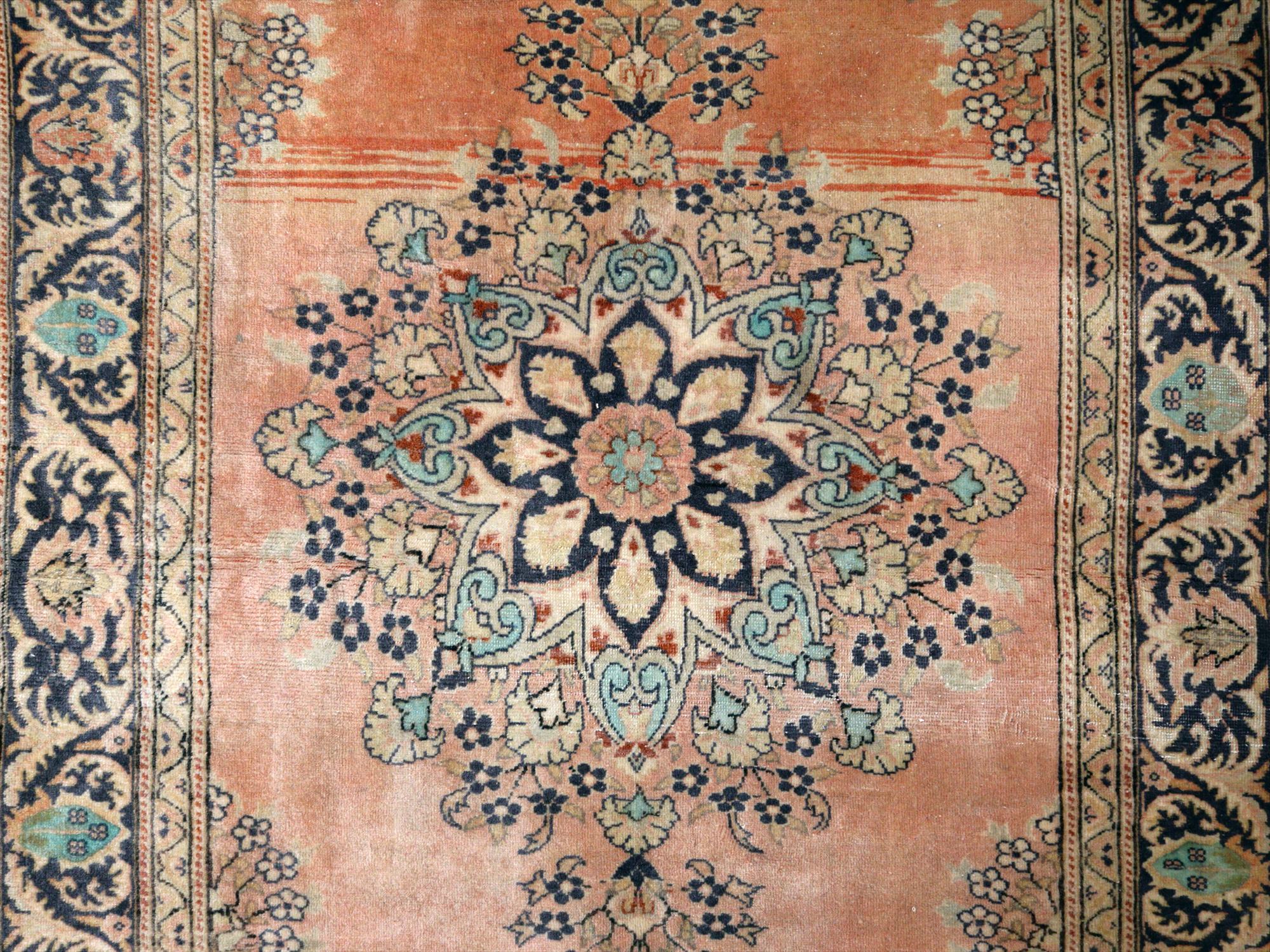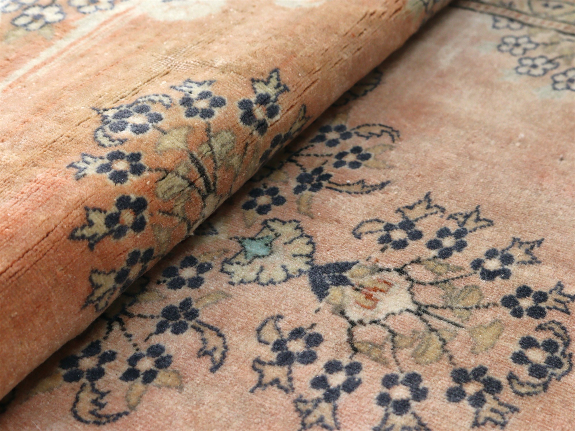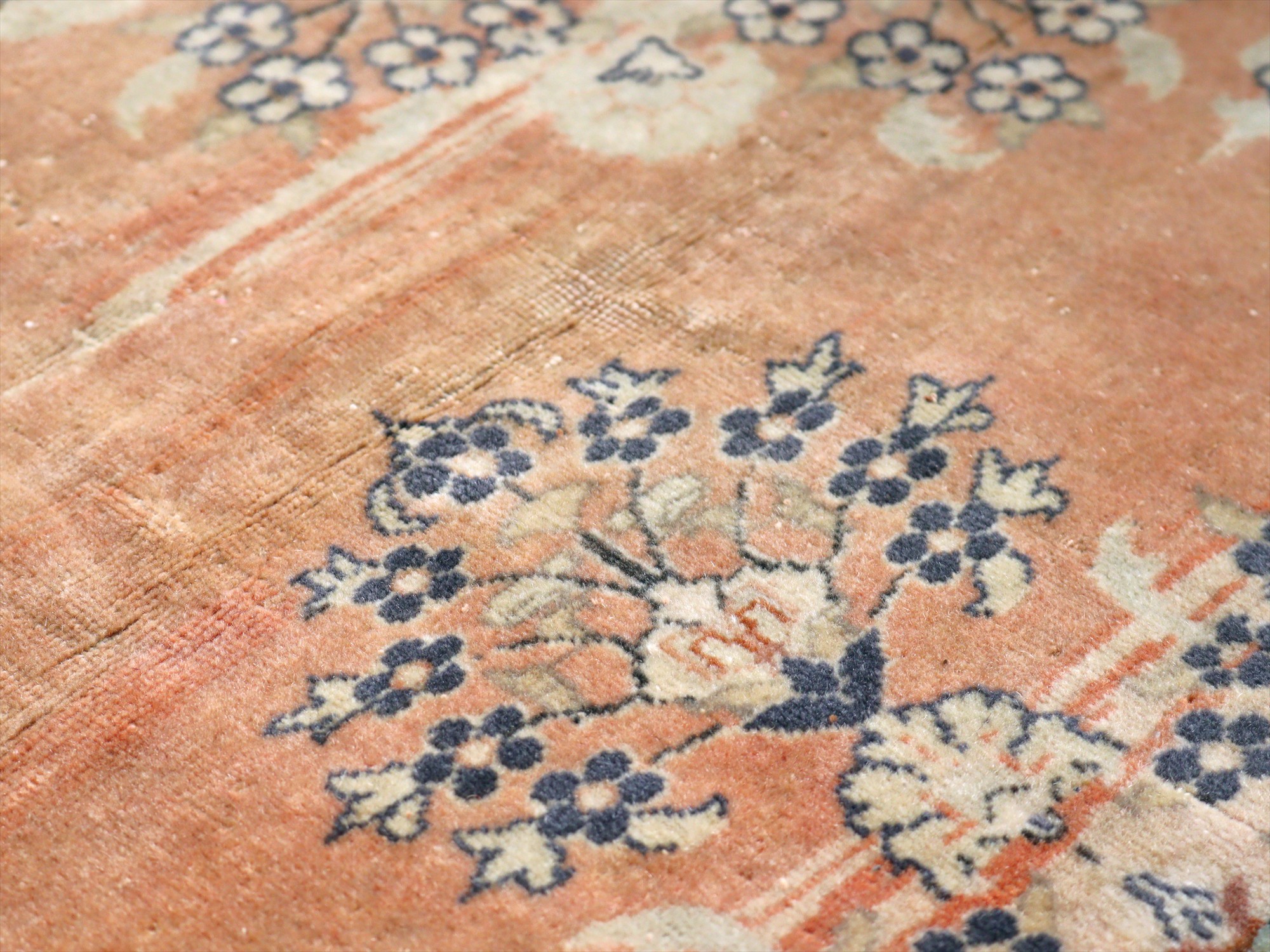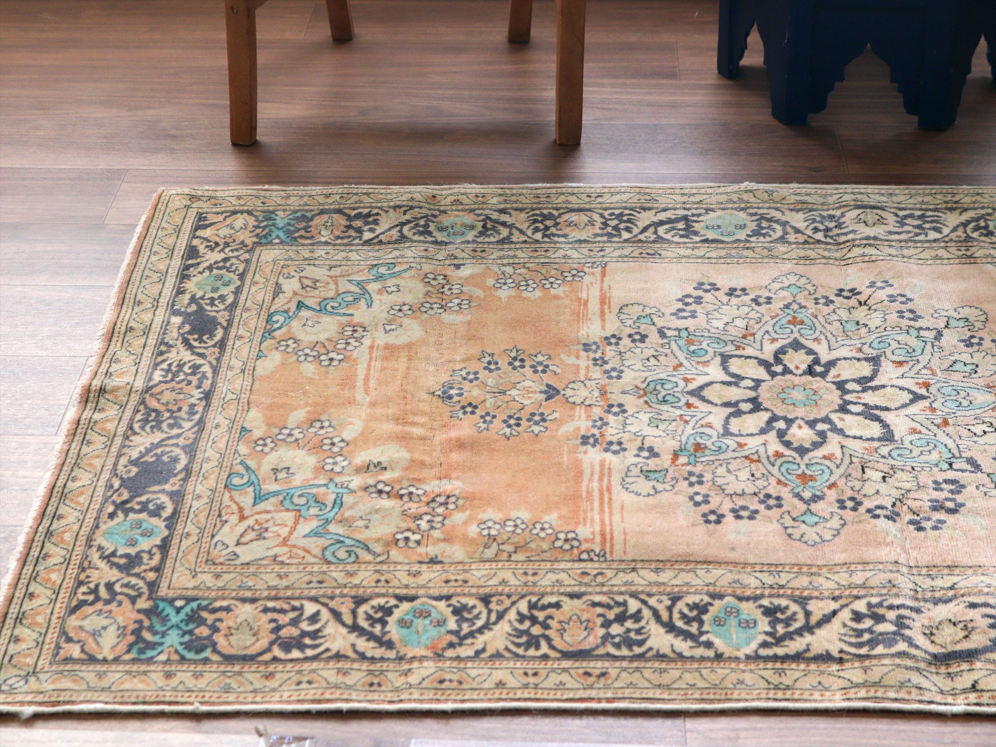 もともとレッドとベージュ基調で織られていたと考えられますが、だいぶ色褪せたことによりパステルカラーに落ち着いています。中央には花形のメダリオン、額縁部分にも花が連なるように描かれた華やかなデザインです。