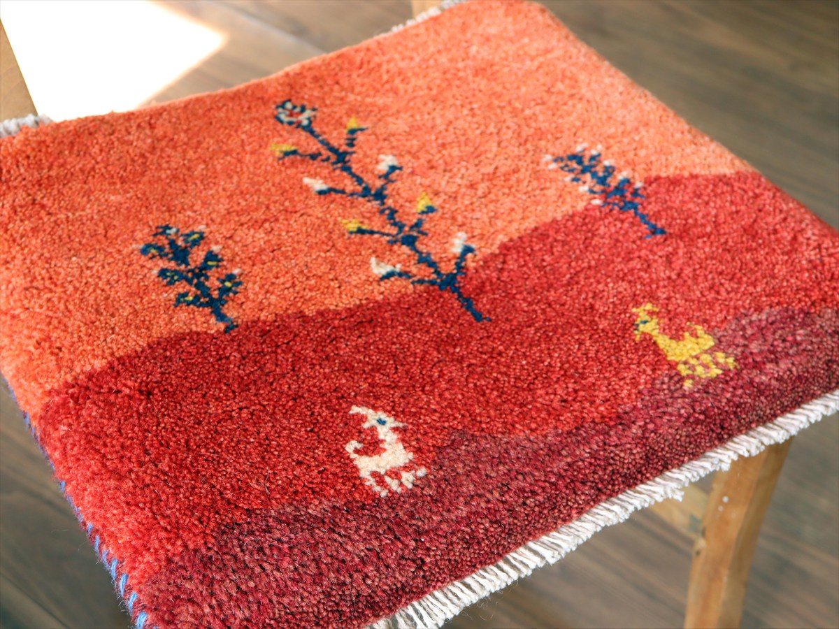 ギャッベ イラン産手織り 座布団サイズ 40×44cm レッド 生命の樹と動物 風景画
