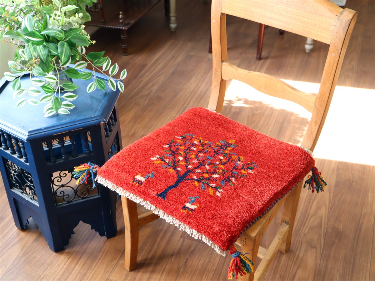 - ギャッベ イラン産手織り 座布団サイズ 40×42cm レッド カラフルな生命の樹と動物