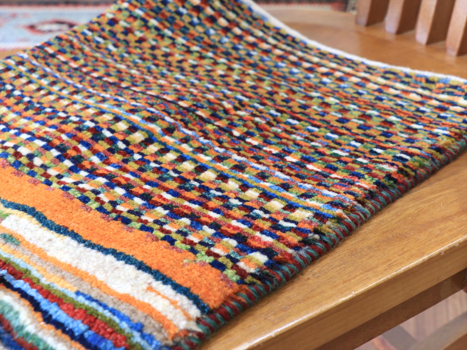 何色ものカラフルな毛糸を使って、織り子さんが色を変えては結んで、色を変えては結んで、を繰り返して仕上げられています。正面から見て下のほうは、ドットの目が大きく変化しているところがユニークです。