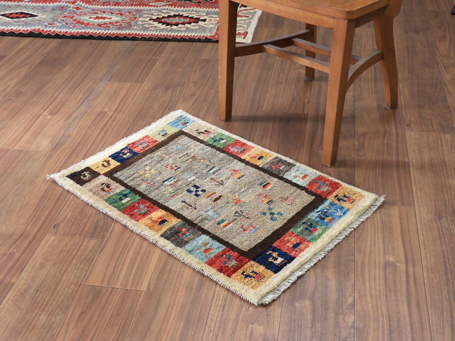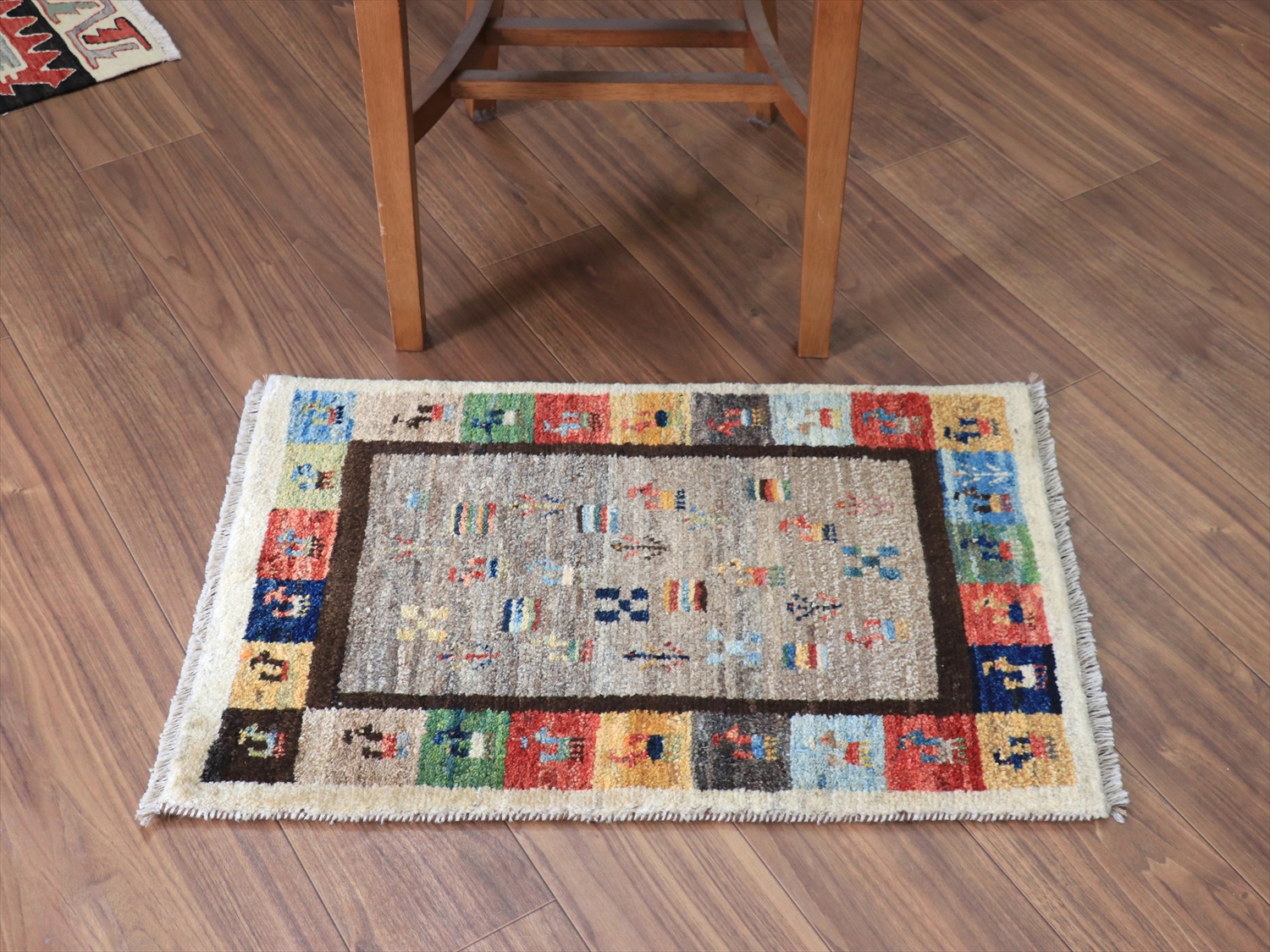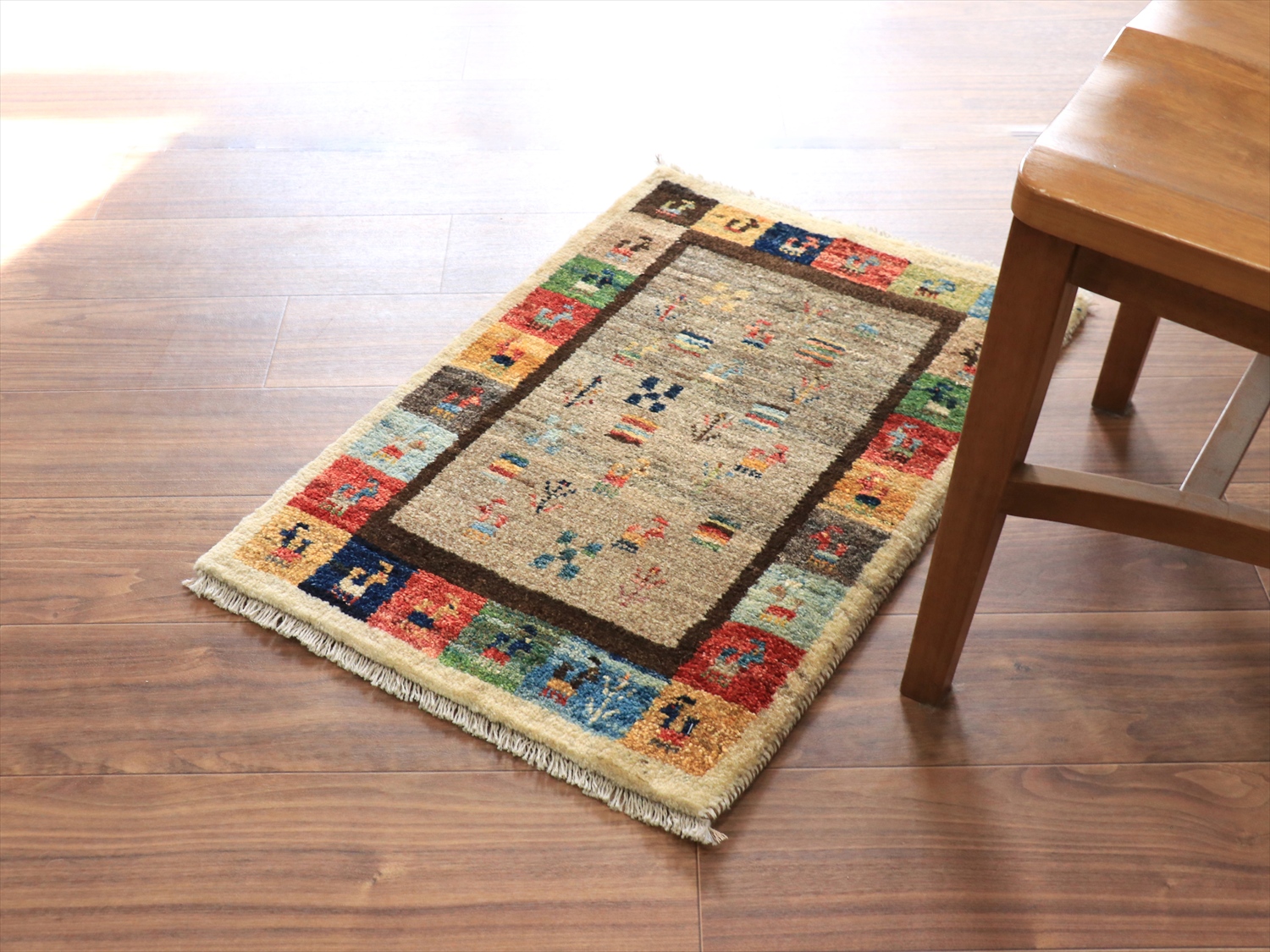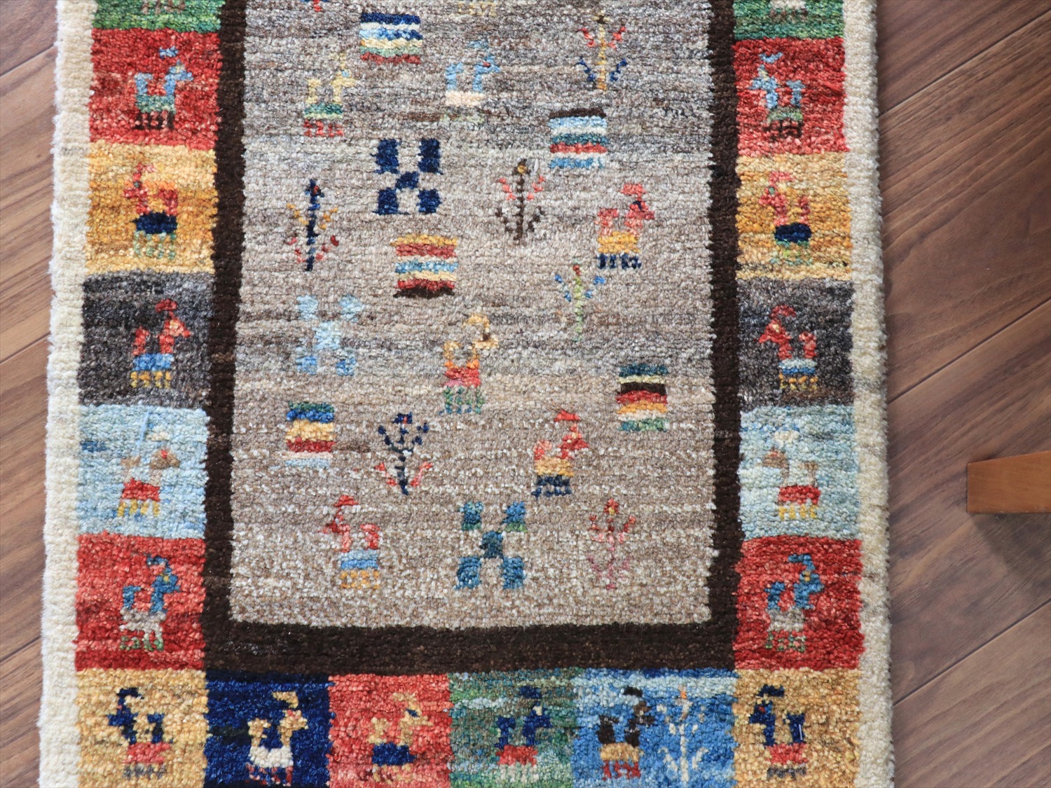 中央のベースの色は、染料を使わずに天然の羊毛の色をそのまま使ったグレー。ランダムは配置で、動物や草花のモチーフが並べられています。周囲のカラフルなタイルモチーフもひとつひとつがかわいらしく、素朴なギャッベのイメージそのままのデザインです。