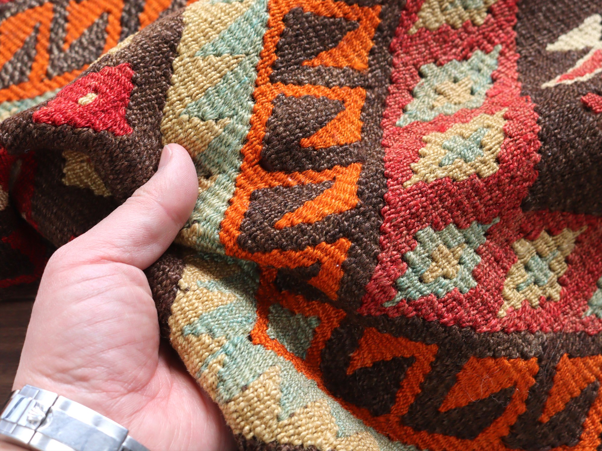 太い糸を使い、ざっくりとワイルドに織られています。織り地はぽてっとした厚みがあります。ターコイズの色糸は日焼けしているようで、裏面と見比べると色褪せているのがわかります。
