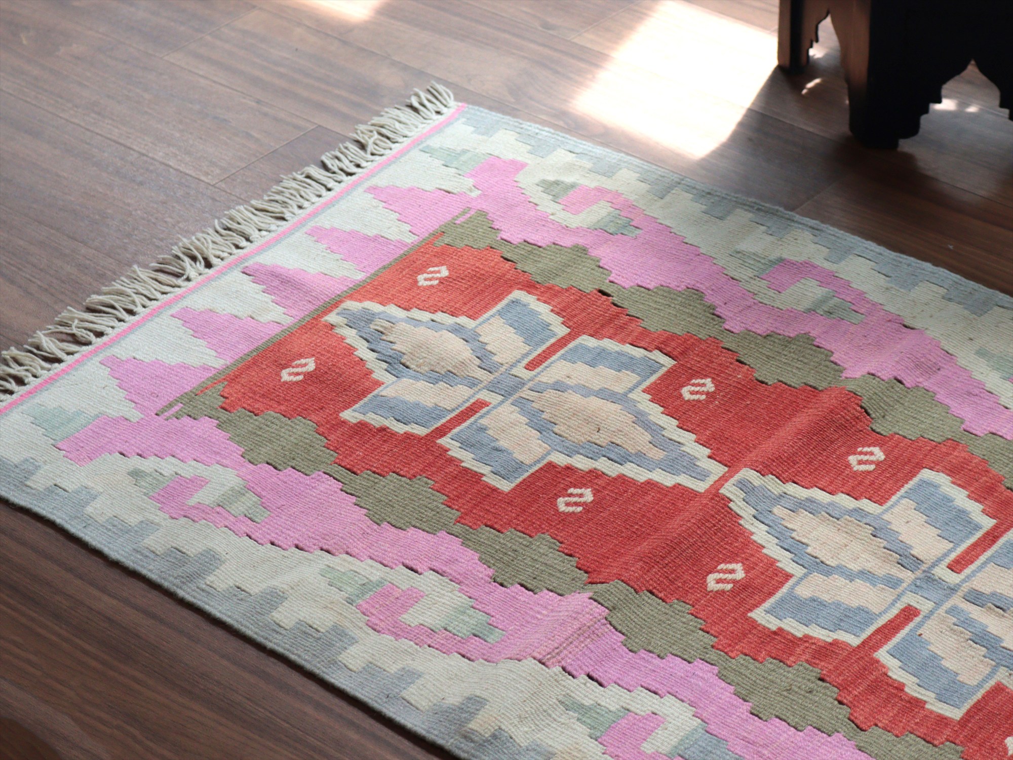 カイセリ産手織りキリム115×77cm レッド&ピンク トルコの手織りラグ