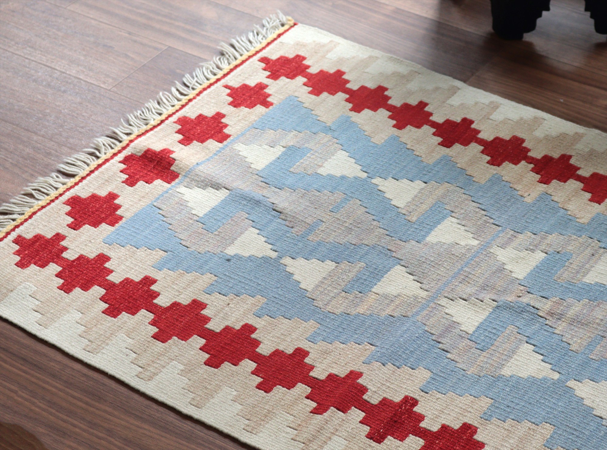 織り地がしなやかでやわらかいのがカイセリキリムの特徴です。やや厚みがあり、やさしい肌触り。色の切り替え部分には、キリムの織りの特徴で、縦に隙間が開いています(スリットと呼んでいます)。
