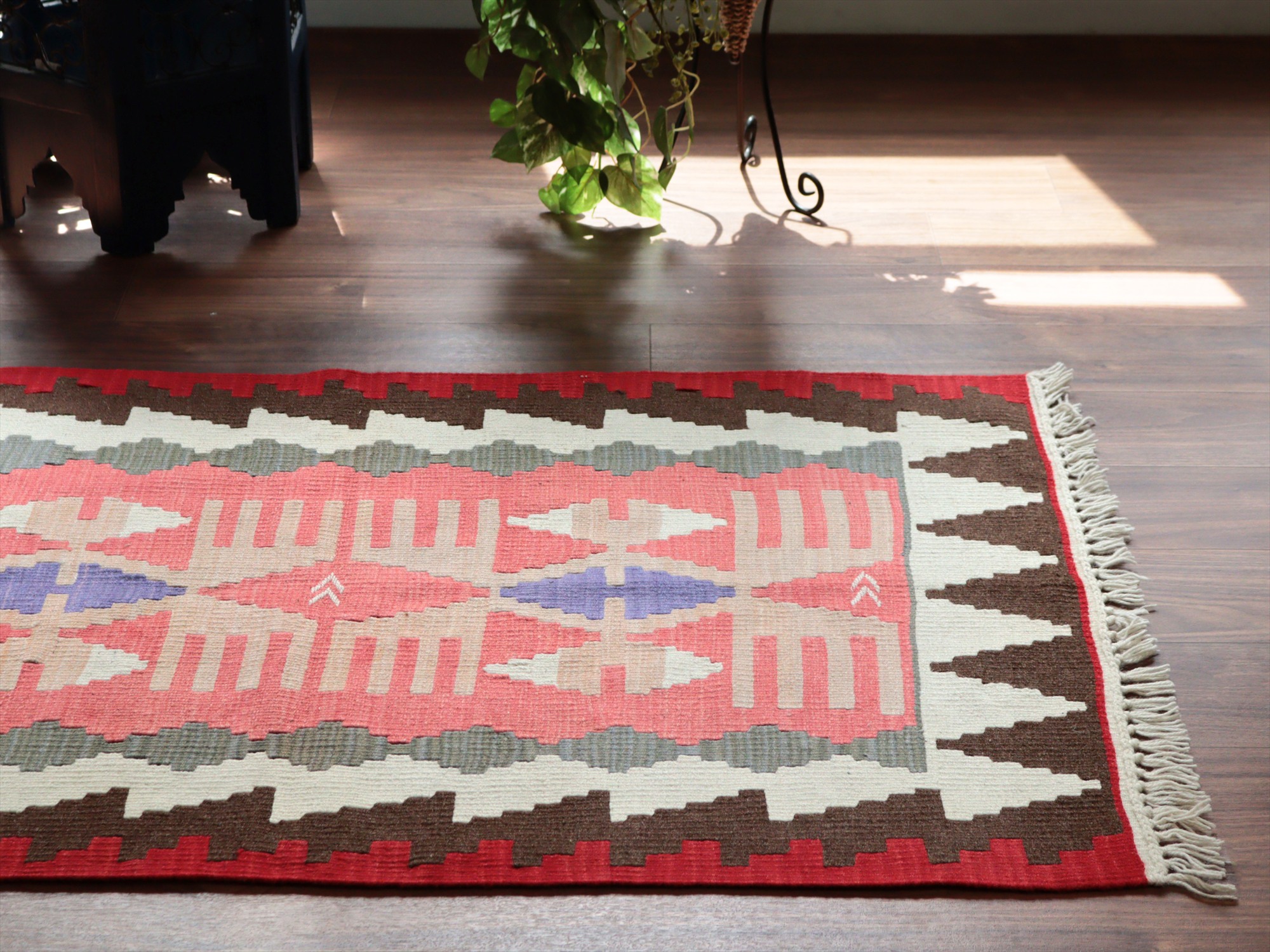 織り地がしなやかでやわらかいのがカイセリキリムの特徴です。やや厚みがあり、やさしい肌触り。色の切り替え部分には、キリムの織りの特徴で、縦に隙間が開いています(スリットと呼んでいます)。