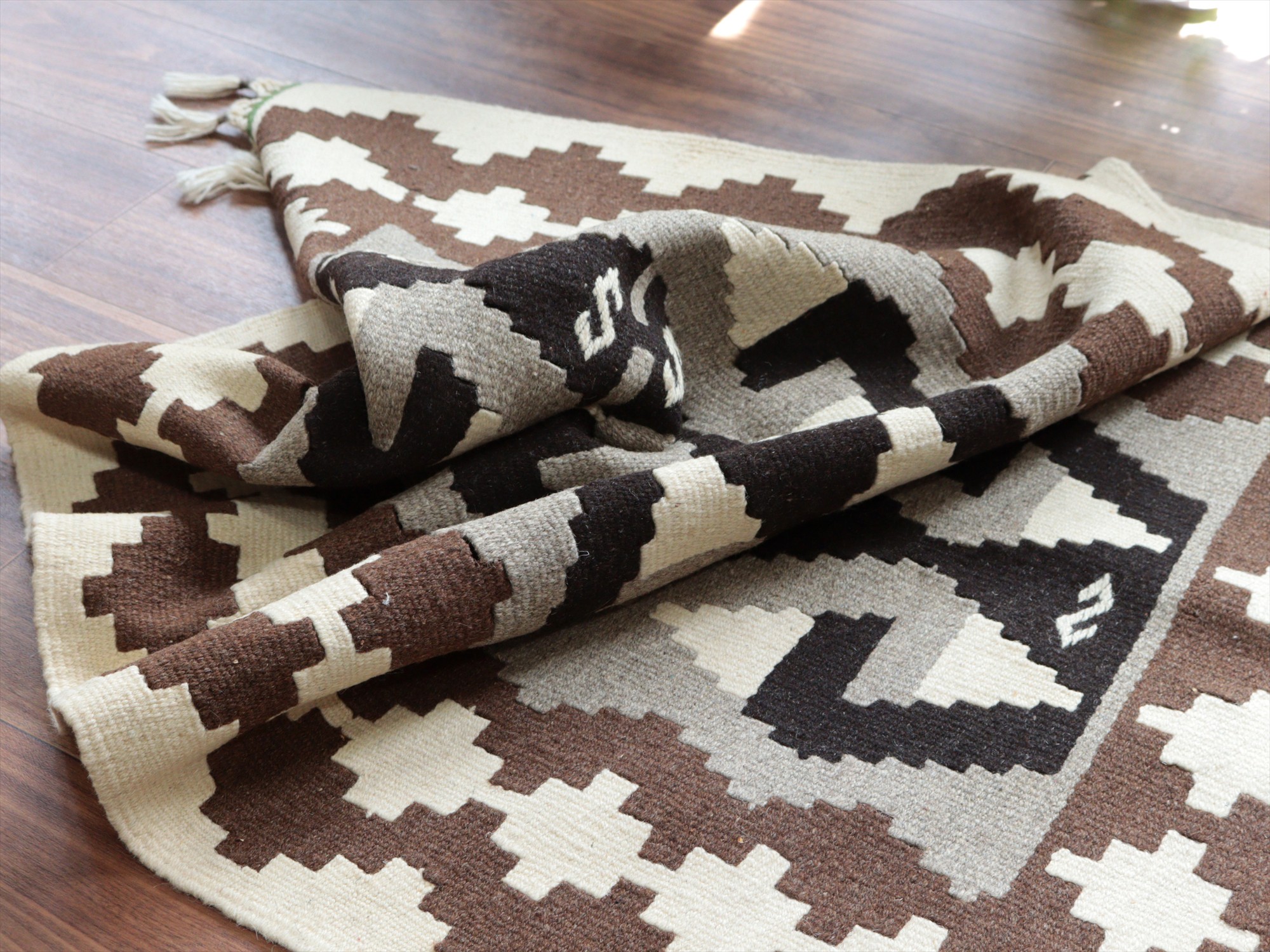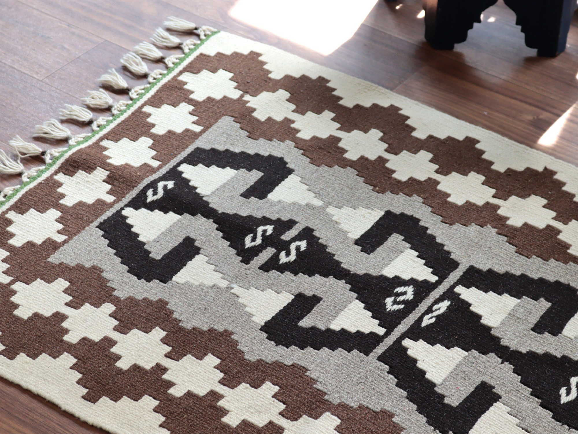 - カイセリ産手織りキリム 雄羊の角125×78cm ナチュラルモノトーン トルコの手織りラグ