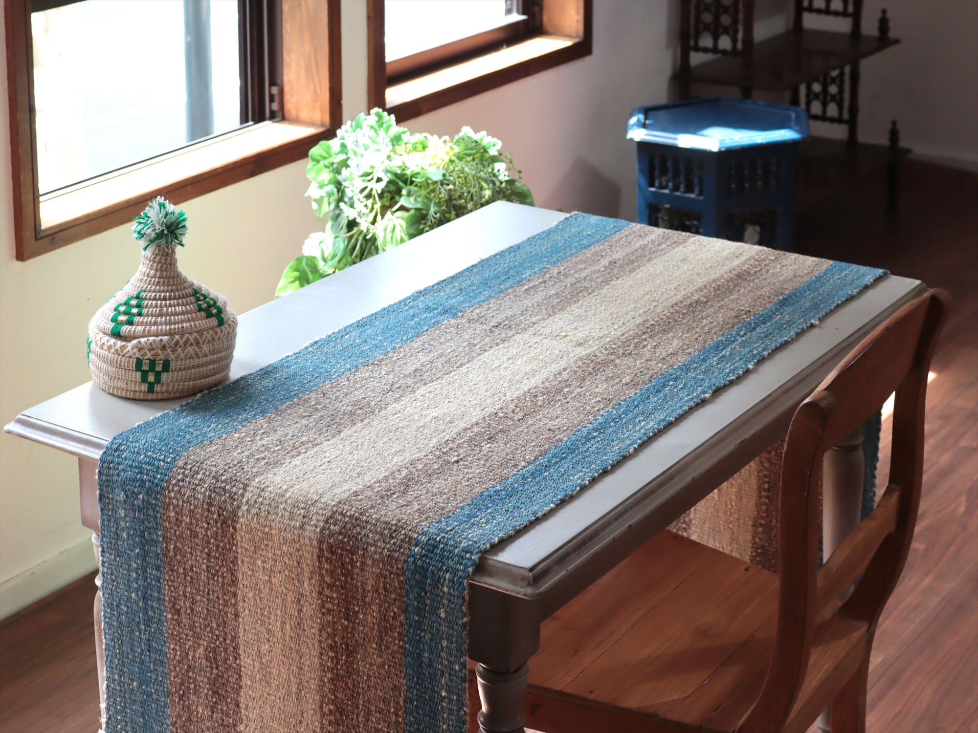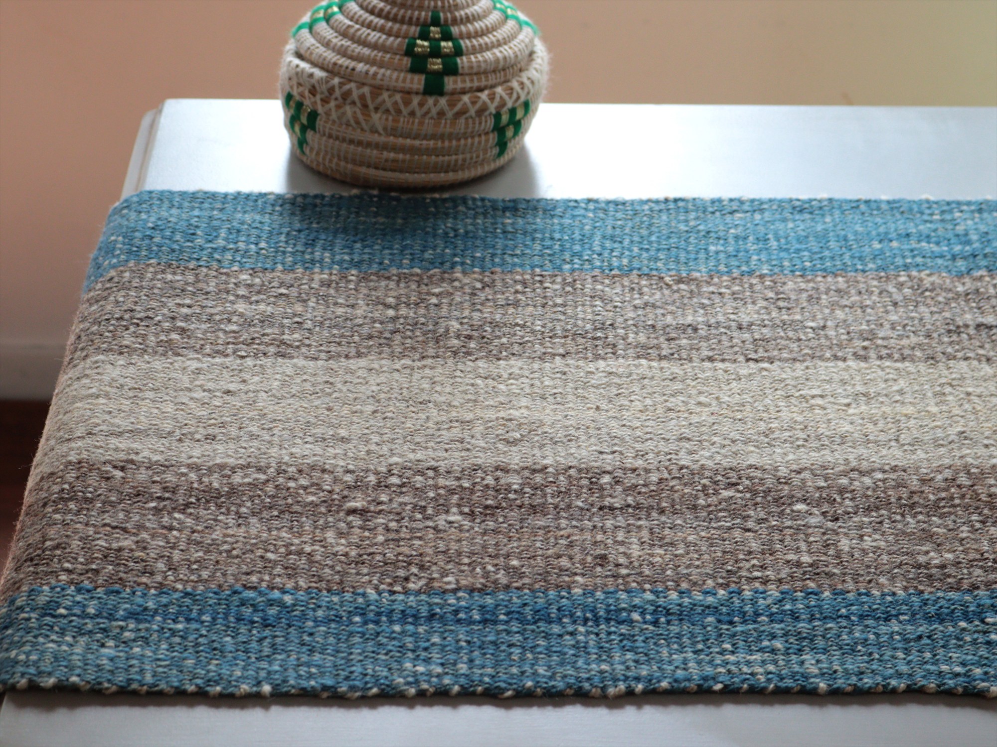 トルコ北東部、カルス地方で織られたキリム。アイボリーとグレー、ブルーの組み合わせで、ストライプが表現されたシンプルなデザイン。