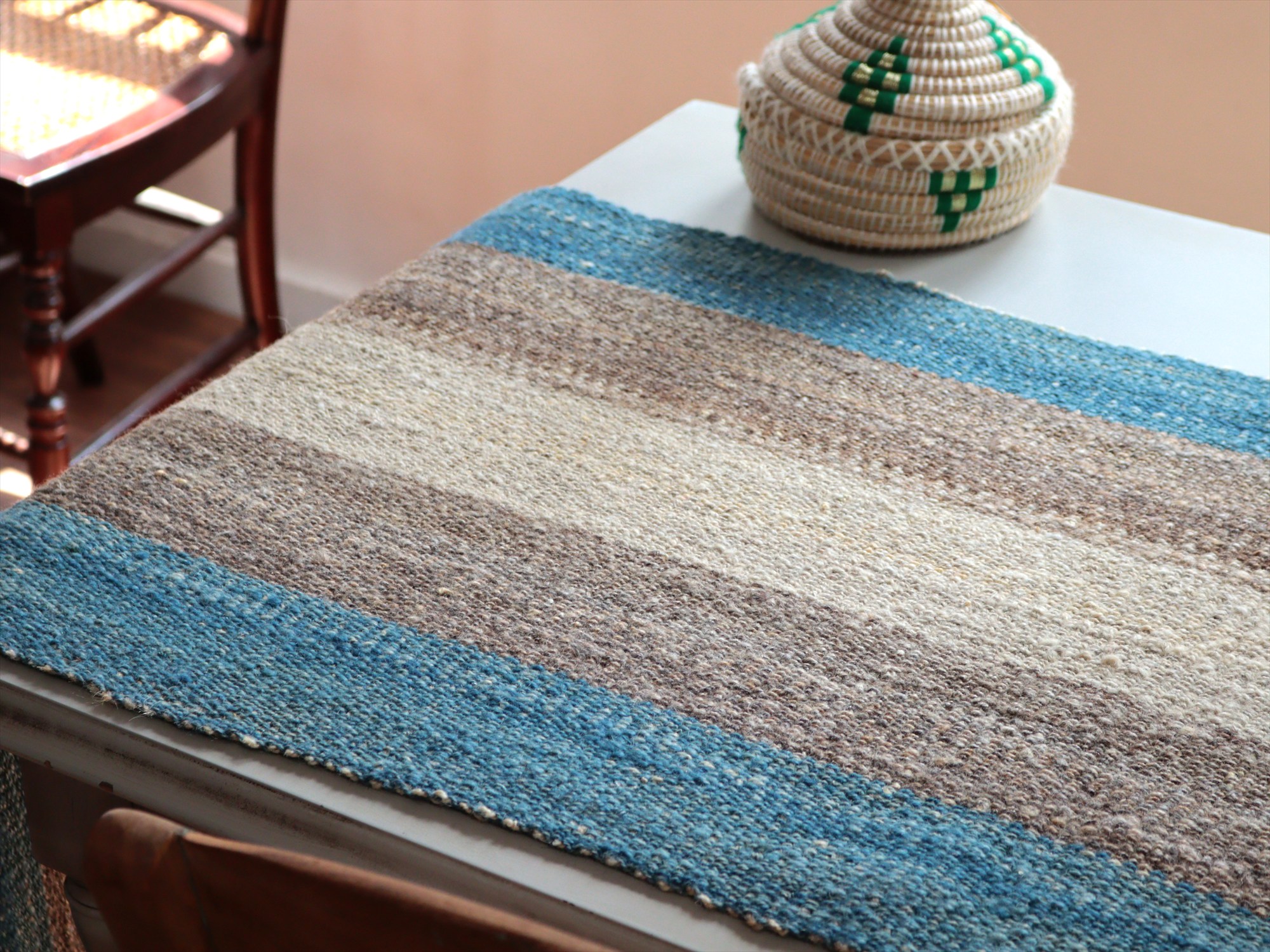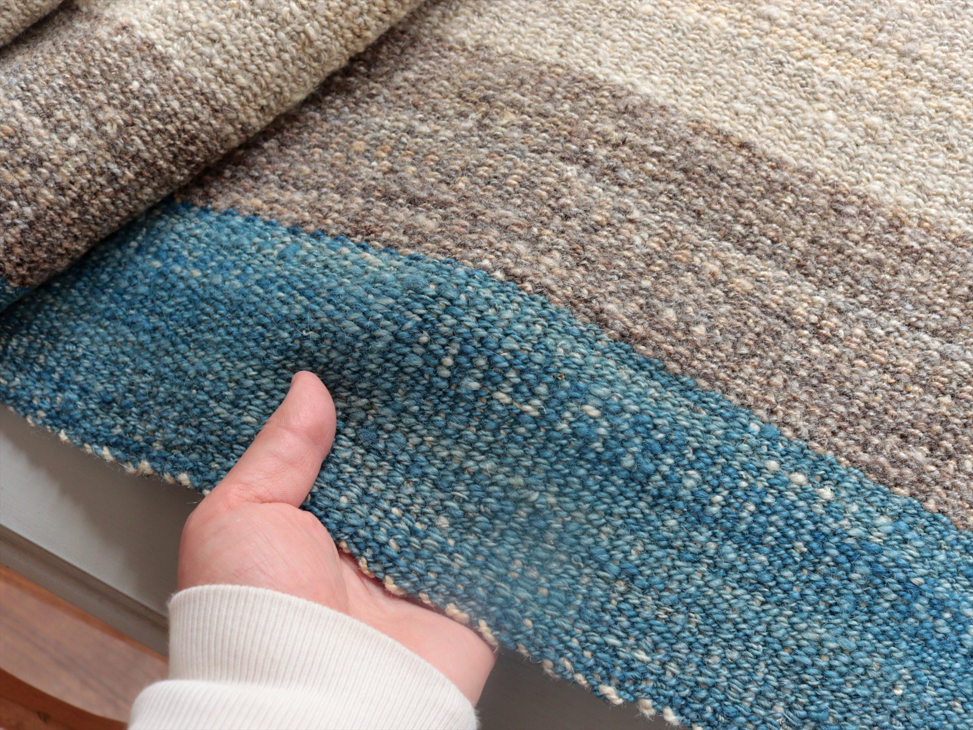 トルコ北東部、カルス地方で織られたキリム。アイボリーとグレー、ブルーの組み合わせで、ストライプが表現されたシンプルなデザイン。
